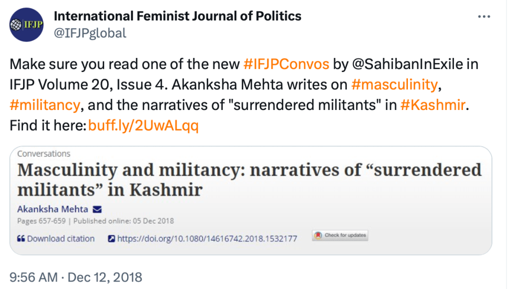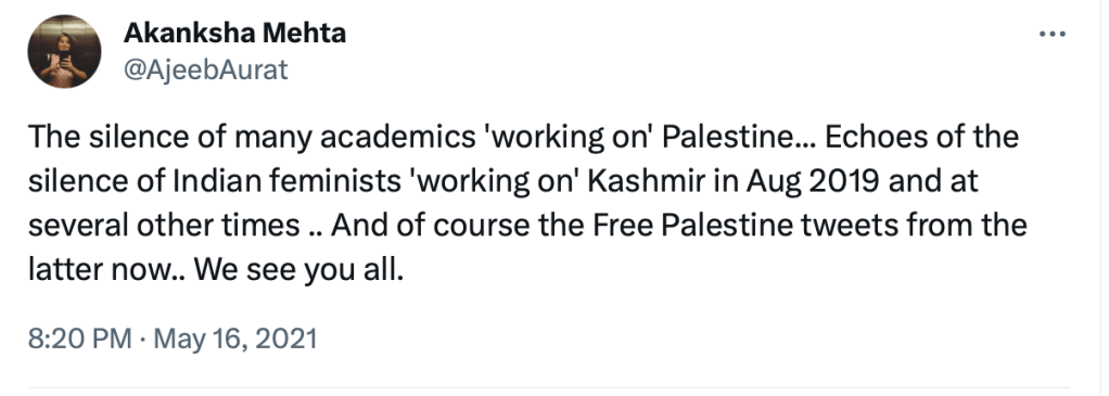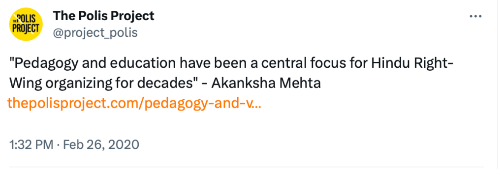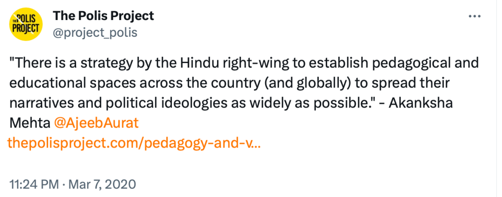 In a 2020 piece for The Polis Project “Pedagogy and Violence Mapping the Everyday politics of Hindutva“, Akanksha Mehta writes on the role of women in Hindu nationalist violence. While claiming Hindu women’s organisations like Durga Vahini and Sevika Samiti participate in everyday violence against Muslims, Christians, Dalits and others, Akanksha Mehta writes “Women in these organizations plan and participate in numerous acts of regular violence and also implore the men in their families to prove their masculinity by embracing violence.” She refers to India’s 10,000 year old history as “imagined India as a Hindu nation” and “glorified Hindu myths”. In the same piece, Akanksha Mehta opines Kashmir is “occupied” by India, calls India a “settler-colonial” and calls for “Azadi of Kashmir”. She ends the piece with “Can we dismantle one dream of the Hindu Rashtra without the dismantling of its longer, colonial, more violent and brutal dreams?” In short, she wants to dismantle Hinduism from India.