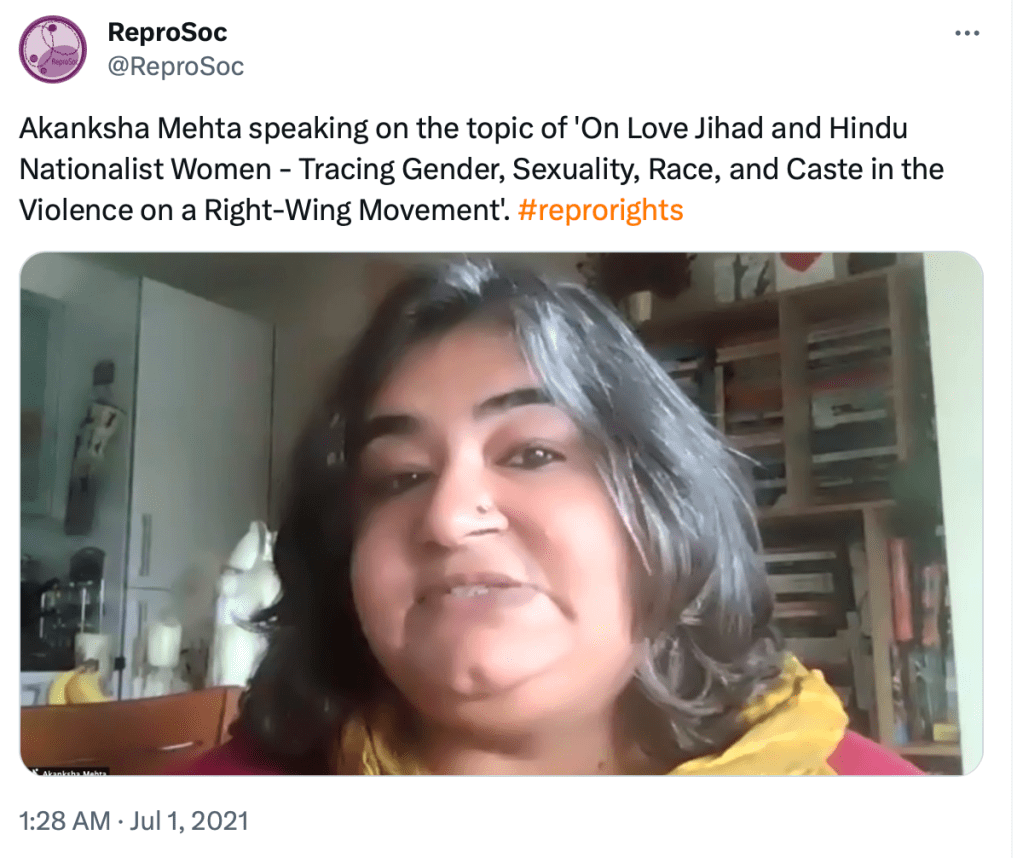 In the same conference, Akanksha Mehta said “notions of gender and sexuality rooted in caste and race are crucial to the Hindutva project“. She said Hindu women “build active discourses of violence that are gendered, caste based, sexed racialized and they distribute them far and wide. They participate in very specific everyday acts of violence, including physical violence and often encourage the men to do the same in order to become real Hindu men. ”