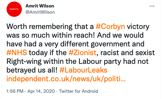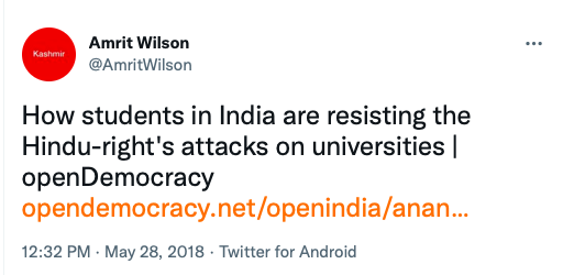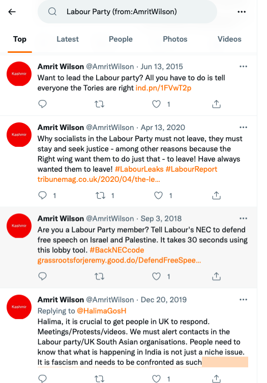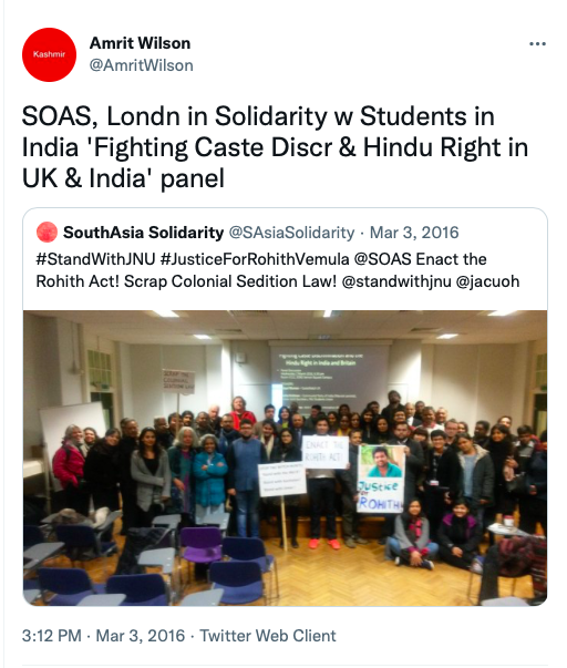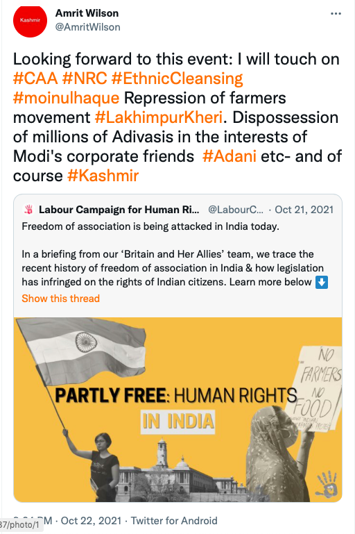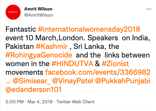 In May 2022, Amrit Wilson along with Virinder Singh Kalra, held on online conference via Zoom for Institute of Palestinian Studies. The topic was “Hindutva & Zionism – The Unholy Alliance” where she drew comparisons between Israel and India and blamed Israeli embassies in India for the rise of Hindutva and attacks on ‘minorities’. She repeats the same arguments for the Hinduphobic, Jewish Voice for Labour in “The unholy alliance: Hindutva and Zionism“.