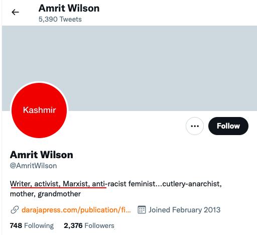 Amrit Wilson is a Britain based anti-Hindu, anti-Semitic, anti-India activist. She was a Senior Lecturer in Womens studies/South Asian studies at University of Bedfordshire, previously known as Luton University. She is a known Marxist feminist. Her area of work is race and gender in Britain and South Asia politics. She often writes for the Hinduphobic, British news paper, The Guardian and Open Democracy. She is co-founder of the Hinduphobic South Asia Solidarity Group (SASG), founder member of Awaaz, The UK’s first feminist collective, active member of Organisation of Women of African and Asian Descent (OWAAD) and former Chairperson of Imkaan, UK based Black feminist organisation working for addressing violence against Black and minority women.