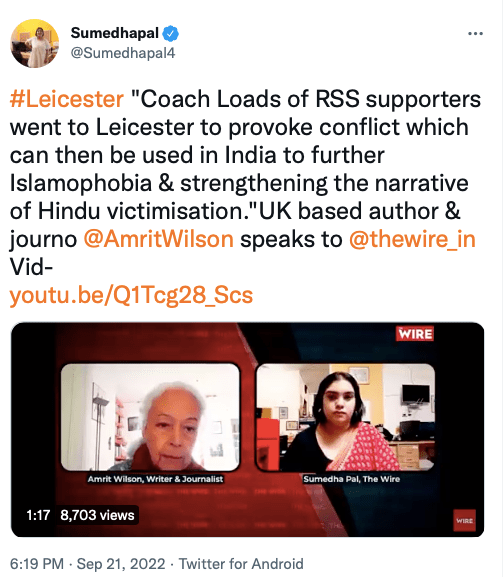 In September 2022, Amrit Wilson was platformed by Hinduphobic news portal, The Wire where she blamed Hindus for the violence in Leicester all while peddling fake news that coach load of RSS supporters were brought in. This fake news was also called out by the equally Hinduphobic British newspaper, The Guardian.