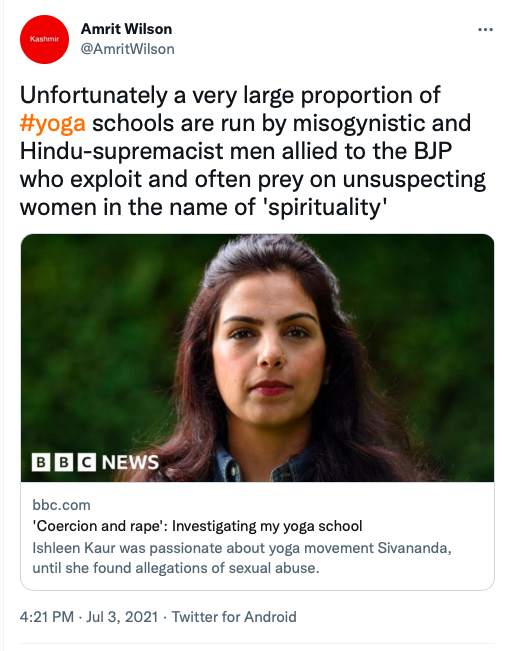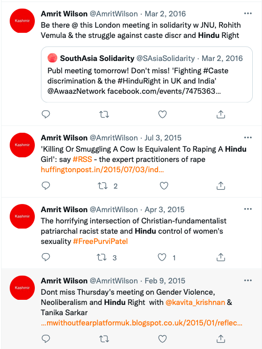 In 2020, in her article for Islamic Human Rights Commission (IHRC) “From Nagpur to Nairobi to Neasden – tracing global Hindutva“, Amrit Wilson opined “The disturbing rise of Hindutva supremacism in India has been mirrored by a corresponding growth of extremism in the Indian diaspora, particularly in the UK where the efforts of such groups are now feeding into public policy decisions” all because Hindus were called to vote for Tories instead of Hinduphobic Labour. In the entire article she makes extreme Hinduphobic references, lies about Gujarat 2002, twists, dismisses and white-washes truth to present Hindus as aggressors.