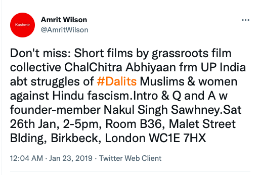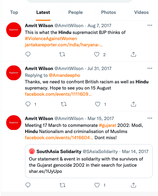 In 2018, Amrit Wilson attacked Hindus in the UK for supporting PM Modi’s re-election, calling them proponents of Hindutva “Hindutva is basically a political ideology rather than religious…….[It is] Islamophobic, it’s misogynistic, and it’s also linked to neoliberalism, to big business. This ideology has been filtered through the Hindu community for many years.”