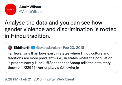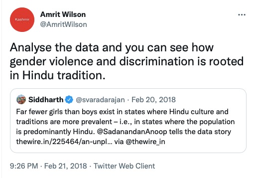 Writing for Bylines in 2021 an article titles “The New Strategies ofHindu Supremacists in Britain“The New Strategies ofHindu Supremacists in Britain“, Amrit Wilson on Hinduphobia states, “Unlike antisemitism, Islamophobia or anti-black racism, it has no historical or material basis.” According to dharmic scholar Sarah Gates, the term “Hinduphobia” was first used in 1866 by Sir Edward Sullivan. Wilson further states violence on Hindus in Bangladesh do happen but “killings and attacks on temples are not a global phenomenon.” She dismisses violence against Hindus in Pakistan, “In Pakistan, there have been attacks on Hindus but they can be seen clearly as just one element of the communal or sectarian violence directed at multiple minorities (including Muslim Shias and Ahmadiyas, Christians and others) by a majoritarian state.” She further states she is a Hindu when her twitter profile clearly mentions her as a “Marxist”.
