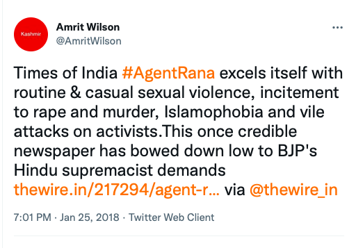 In 2018, Amrit Wilson while writing for the Guardian “India is a ‘republic of fear’. The UK must keep the pressure on Modi” blamed Hindutva for 2 rape cases that rocked the nation ignoring multiple rape cases of Hindu girls in the rape Jihad by Indian muslim community. In another article on gender violence “Narendra Modi as prime minister would roll back women’s rights in India” in 2014, Amrit Wilson accused Hindus of violence against Muslims and Christians, called anti-Hindu pogrom of Gujarat 2002 as “2002 pogrom against Muslims”, peddles leftist lies that countless “women and girls were raped” during Gujarat 2002 violence not ever mentioning the burning of 56 women, men and children of the Sabarmathi Express. She also dismissed “love jihad” as a trope saying there is “no factual basis”. She further says: