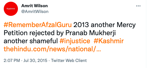 In 2007, Amrit Wilson along with British Labour MP John McDonnell, Adnan Siddiqui of CAGE, and Fahad Ansari of IHRC wrote a letter in support of Indian Parliament attack mastermind and terrorists Afzal Guru. The letter states that Indian investigative agencies ‘fabricated’ and ‘forged’ documents to frame Guru and that the names of attackers were still not known. In 2016 article in India.com, the author mentions the attackers names as Hamza, Haider alias Tufail, Rana, Mohammed and Raja. The terrorists belong to Pakistan based Jaish e Mohammed and Lakshar e Tayyba under direct supervision of Pakistan’s ISI. Amrit Wilson even wrote an article recounting her fond memories of meeting Afzal Guru in Jammu and Kashmir Law and Public Police (JKLPP) website.
