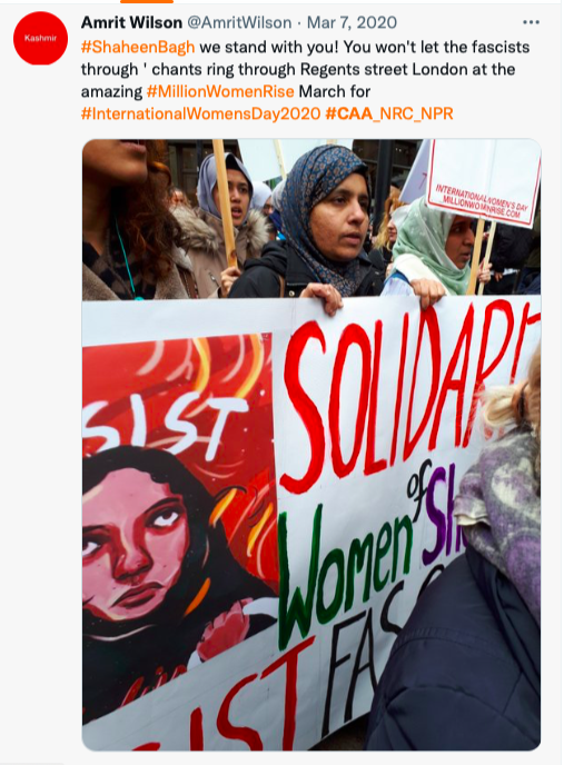In another article for Counterfire, India rises against Modi, Amrit Wilson calls India a “brahminical Hindu state”, calls Citizenship Amendment Act “breach of international law…providing a path for ethnic cleansing”. Further talking about farmers protest, Amrit Wilson writes “Mobilising and supporting these protests must be a priority for the movement.”