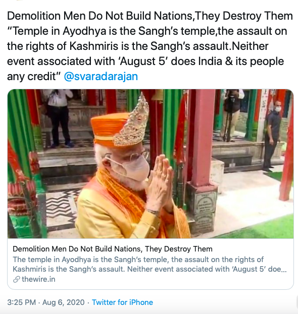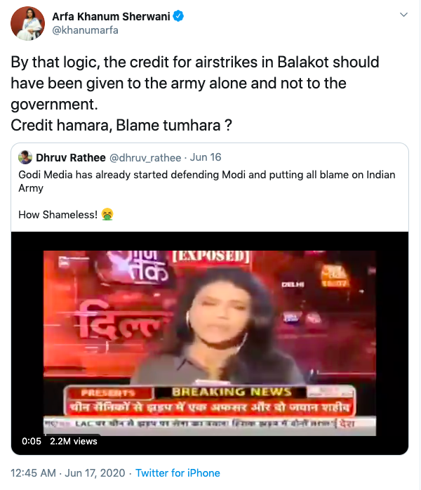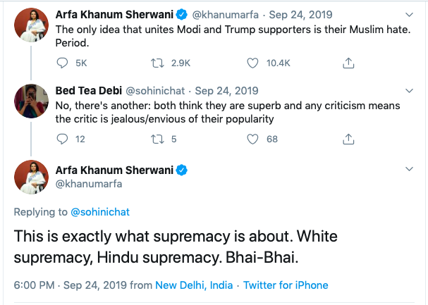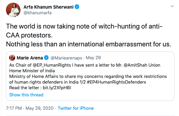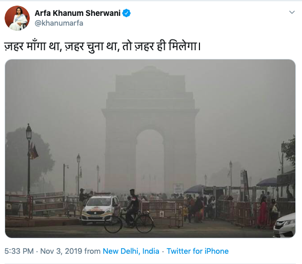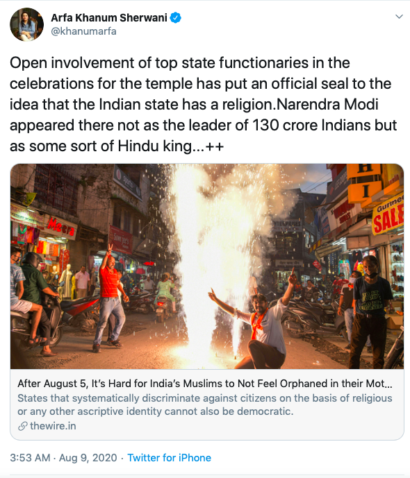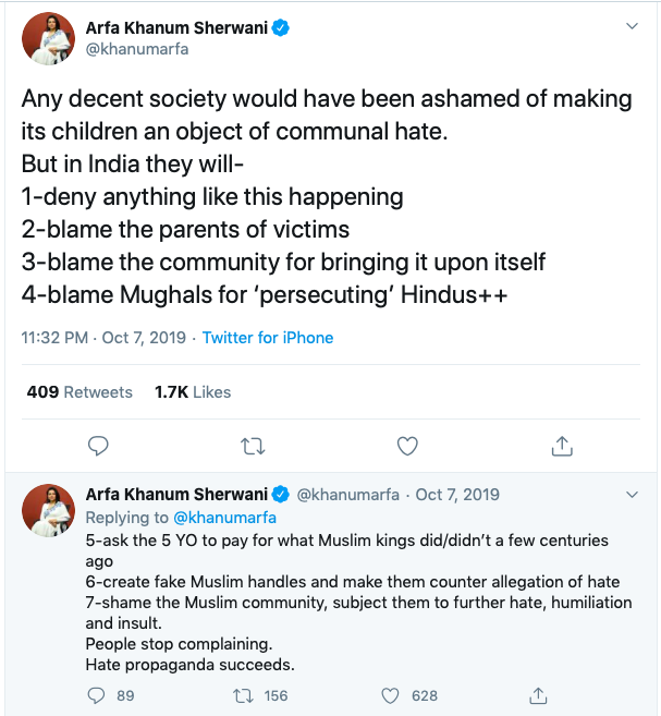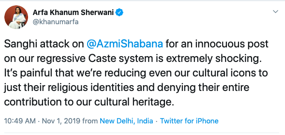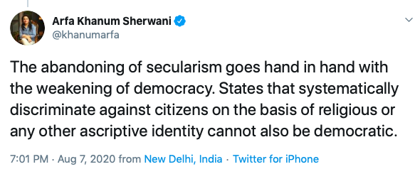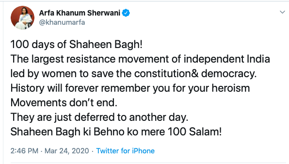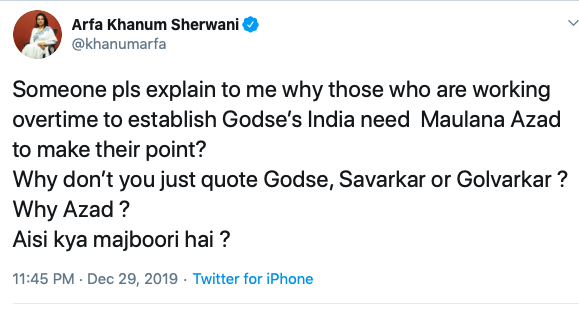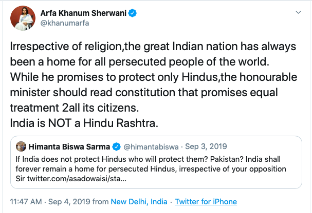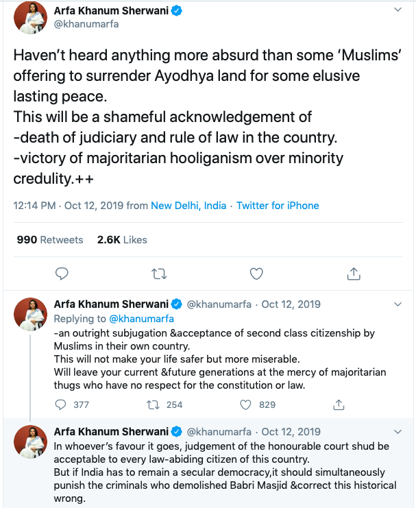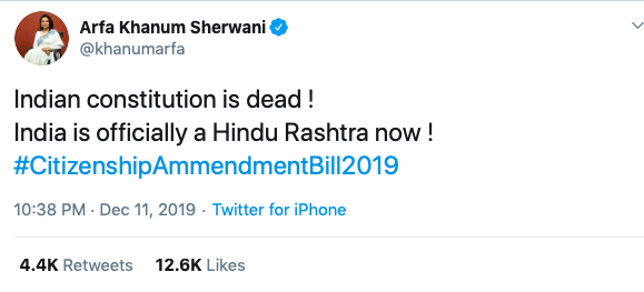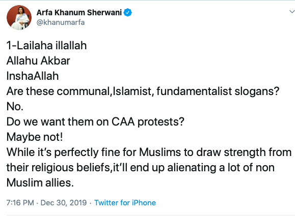 Arfa believes ‘Bharat Mata ki Jai’ slogan is a communal and majoritarian slogan. While Islamic slogan ‘La illah illallah’ is “not communal, Islamist, fundamentalist slogan”. During Anti-CAA, Arfa was one of the many Indian journalists who deliberately lied about CAA to Indians living in India and abroad. She protested against the Ram Mandir verdict and often plays victim to ‘perceived’ sense of persecution.