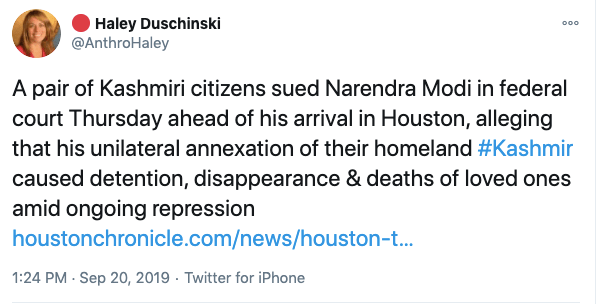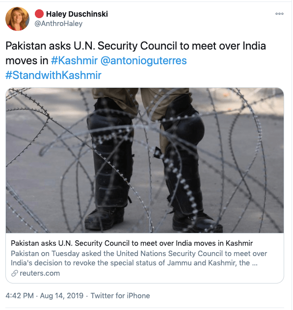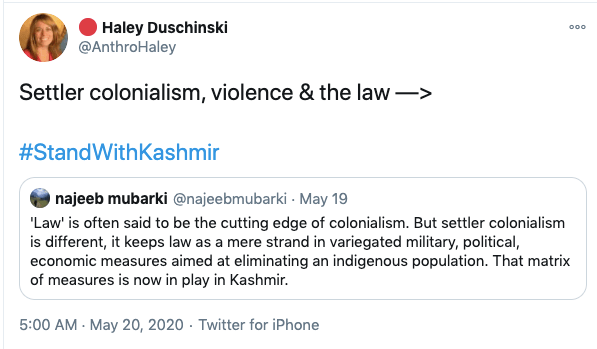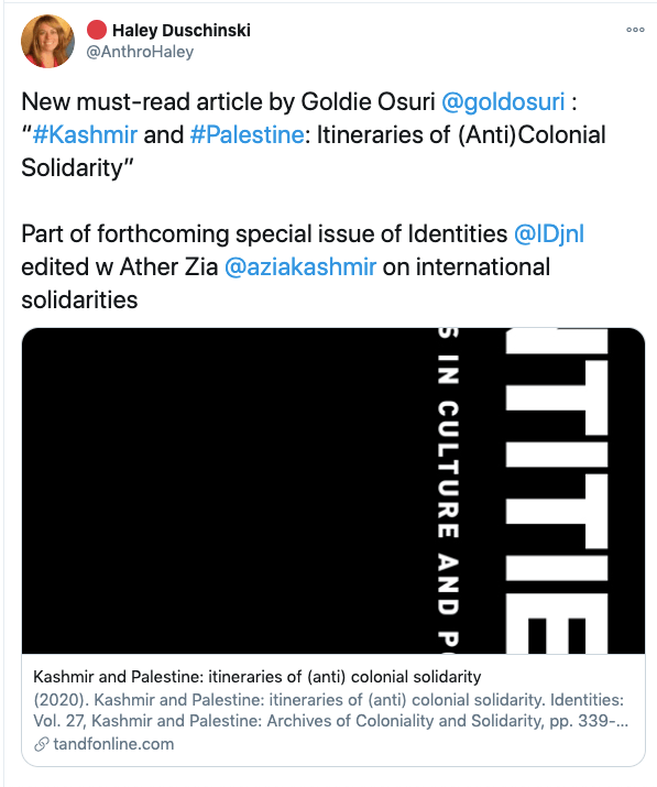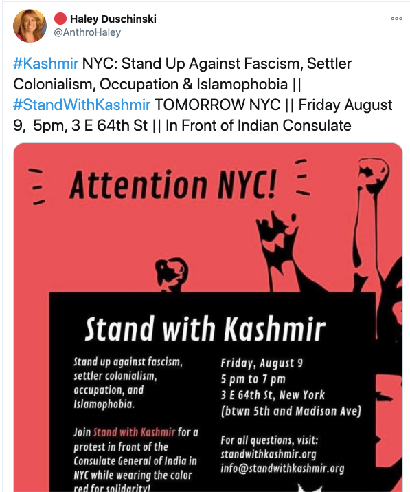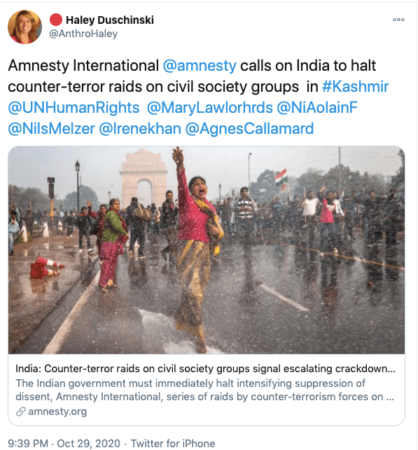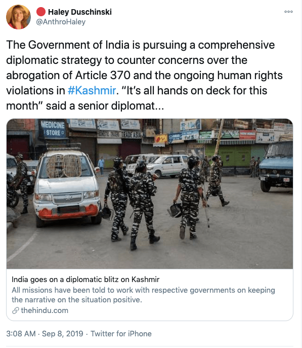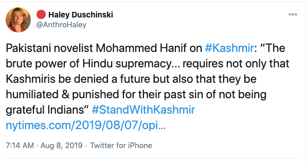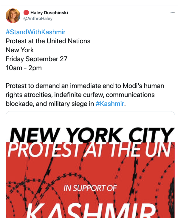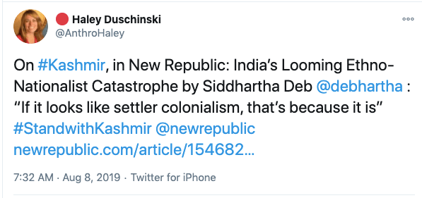 In an article titled The international community must intervene on Kashmir co-authored with Mona Bhan, Goldie Osuri, Haley likens India to Israel and Kashmir to Palestine. She says “The annexation of Kashmir is the latest move by the Modi administration, performed by abolishing the special status of J&K and bifurcating the region into two Union Territories. This move sets the scene for India’s inauguration of an Israeli-style settler colonialism.” On the one-year anniversary of the abrogation of Article 370 and 35A, again co-authoring an artilce with Ather Zia, Mona Bhan titled Politics of Annexation and Settler Colonialism in Kashmir, Haley writes, “Kashmiris fear that India’s extractive infrastructure in Kashmir along with the fortification of military settlements will further the process of land and resource alienation and normalize the discriminatory systems of segregation and apartheid.”