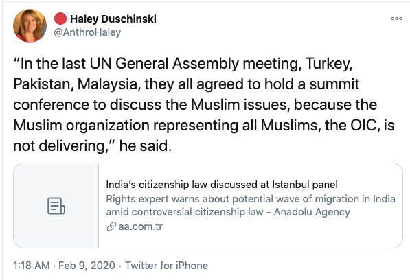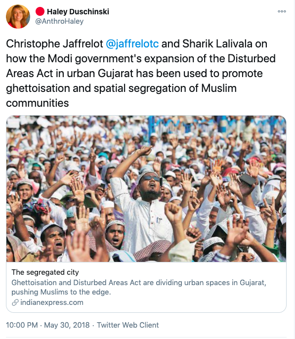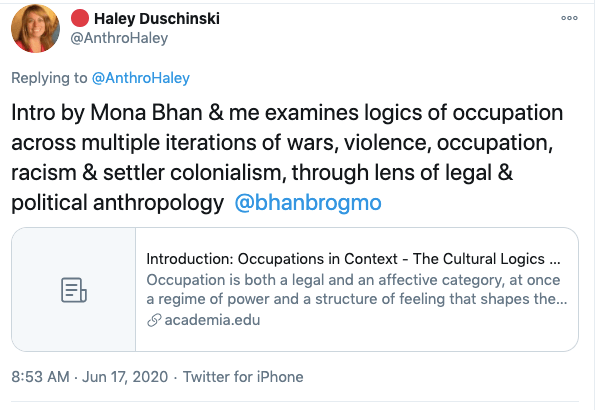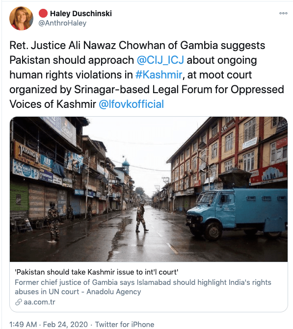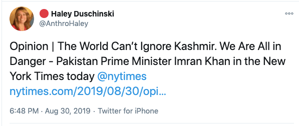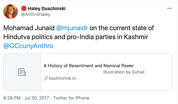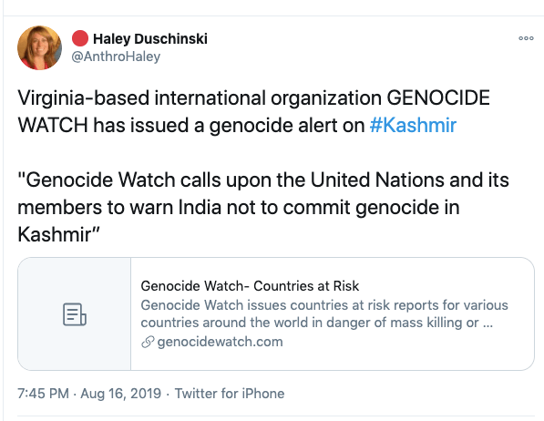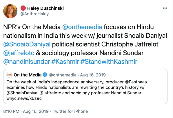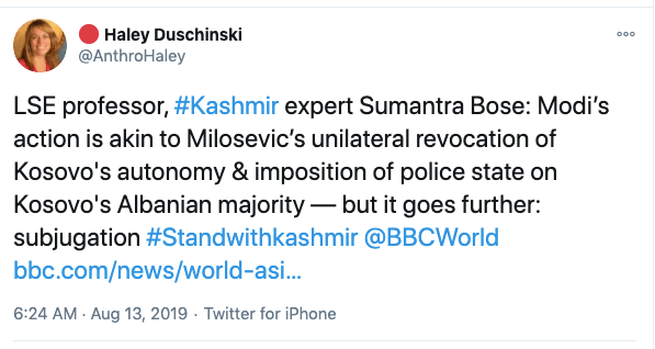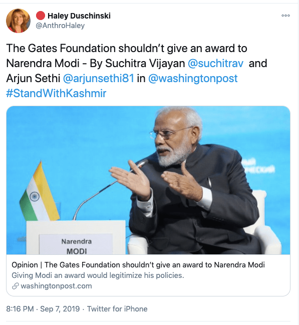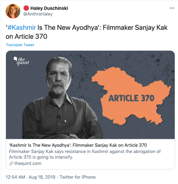In an article titled The international community must intervene on Kashmir co-authored with Mona Bhan, Goldie Osuri, Haley likens India to Israel and Kashmir to Palestine. She says “The annexation of Kashmir is the latest move by the Modi administration, performed by abolishing the special status of J&K and bifurcating the region into two Union Territories. This move sets the scene for India’s inauguration of an Israeli-style settler colonialism.” On the one-year anniversary of the abrogation of Article 370 and 35A, again co-authoring an artilce with Ather Zia, Mona Bhan titled Politics of Annexation and Settler Colonialism in Kashmir, Haley writes, “Kashmiris fear that India’s extractive infrastructure in Kashmir along with the fortification of military settlements will further the process of land and resource alienation and normalize the discriminatory systems of segregation and apartheid.”
