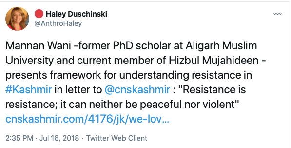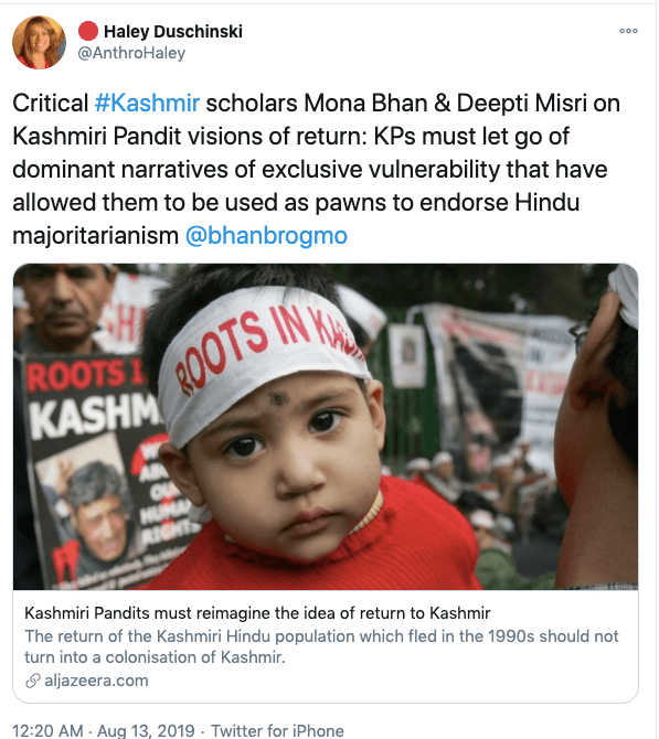 While claiming to espouse the interests of Kashmiri Pandits , Haley Duschinski in an article titled Survival Is Now Our Politics: Kashmiri Hindu Community Identity and the Politics of Homeland, opens the article with the line “Kashmiri Hindus are historically privileged cultural and religious community” while ignoring genocide at the hands of Islamic invaders such as Sikander Butshikan and more recently 19th January 1990 genocide. Talking about the community further in the article she opines “Kashmiri Pandits, the small minority that had become established as the clerical caste of revenue administrators and office holders, enjoyed privileged access to educational and occupational opportunities in relation to the Kashmiri Muslim masses”. In the same article, Haley goes on to say “In 1989, Kashmiris, feeling themselves increasingly frustrated with longstanding patterns of misgovernment in the region, took to the streets in Srinagar and other towns in Kashmir Valley in an open revolt against Indian state rule.” While never pointing fingers at the Pakistan-sponsored terrorism in the valley Haley justifies and blames India saying “the militant movement resulted from the political alienation or economic deprivation of Kashmiri Muslim”.
