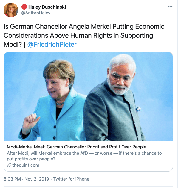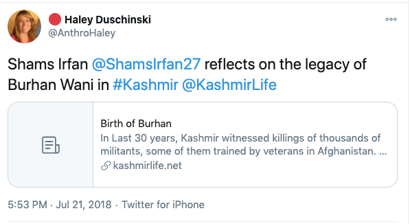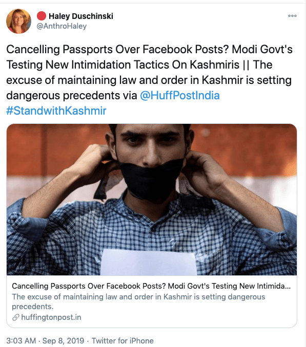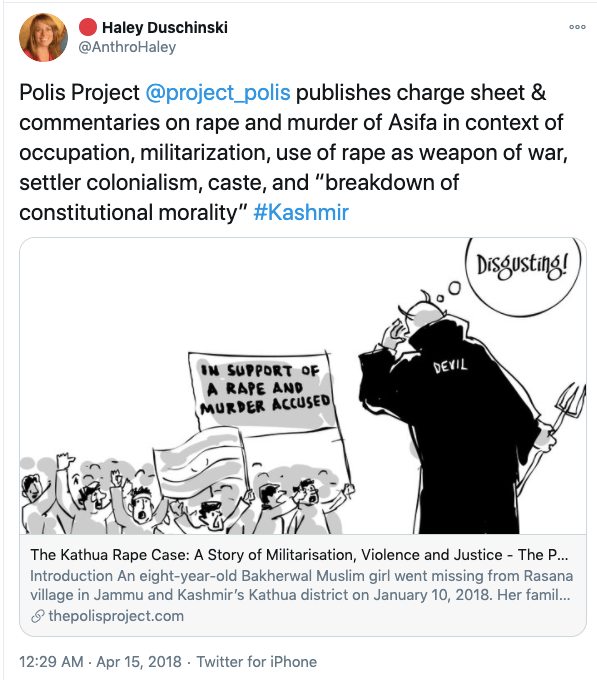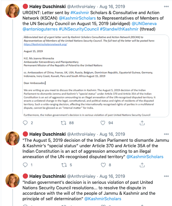The biggest and most lies Haley Duschinski told was in the Tom Lantos Human Rights Commission hearing on Jammu and Kashmir in Context on 14th November 2019. In the beginning Haley says her testimony is based on “credible media sources and six-fact finding reports published by Indian civil society groups”. In the whole document Haley never raises Pakistan’s role in radicalisation of Kashmiri population and cross-border terrorism, she says “the second stage of Indian occupation of Kashmir began in the late 1980s as Kashmiris launched a popular armed rebellion against the Indian state”. Then gives figures that lie about the number of Indian troops in the state. She then goes to claim with no evidence or facts to back up her claim “Indian military, police and paramilitary forces have carried out extra-judicial killings, arbitrary detentions, enforced disappearances, torture and sexual assault”. The whole testimony is replete with conjectures and opinions with no factual evidence. She has quoted newspapers like The New York Times, The Independent, The Wall Street Journal, and the Washington Post which are known anti-India, Hindu hating news papers.