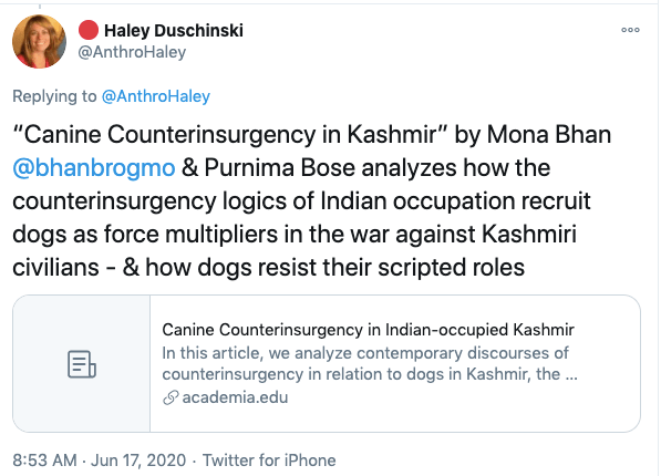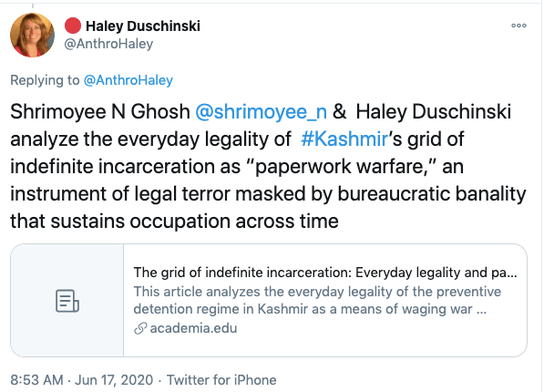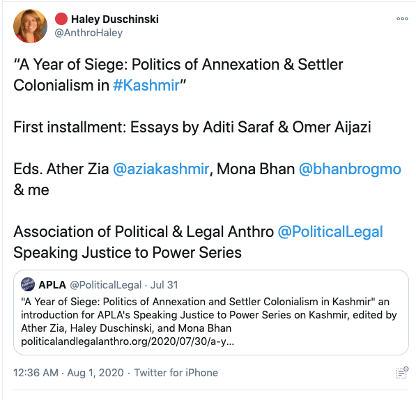 Dr. Haley Duschinski is an Associate Professor of Anthropology, Graduate Director of M.A in Law, Justice and Culture, and Director of the Center for Law, Justice & Culture at Ohio University (CLJC). Her area of specialisation amongst others are South Asia, India and Kashmir. Her research specialisations are violence, war, and power; law and society; human rights, militarisation and impunity; and law and memory in Kashmir. Haley is a Kashmiri separatist and is the the co-founder of a dodgy organisation called Stand with Kashmir. The other co-founders are Ather Zia, Hafsa Kanjwal, Mohammed Junaid, and Huma Dhar. Haley is also founding member of the Critical Kashmir Studies “scholarly collective”.