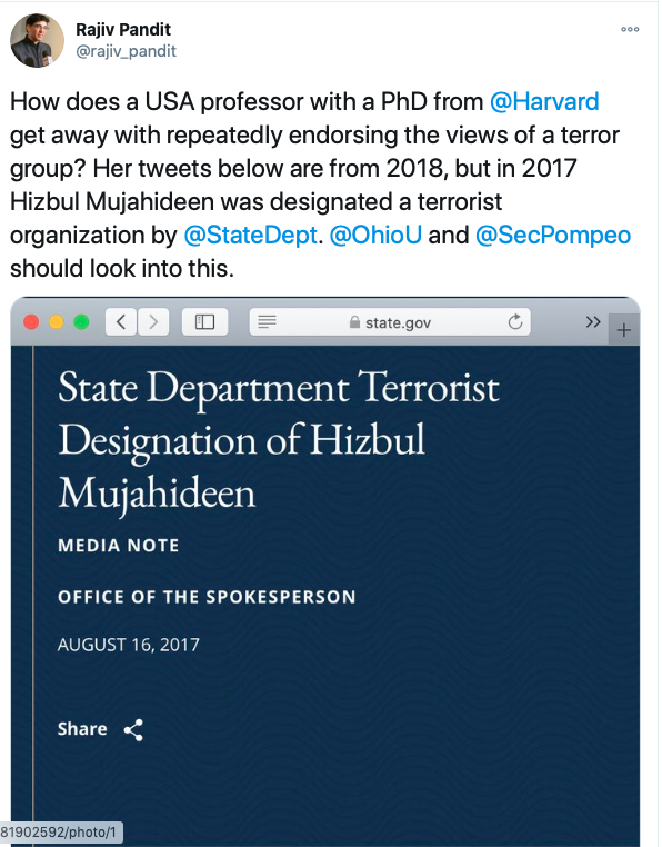 Rajiv Pandit, member of HAF (Hindu American Foundation) highlighted Haley’s endorsement of terror outfits such as Hizbul Mujahideen while the group was designated as a terror organisation by United States Department of State.
