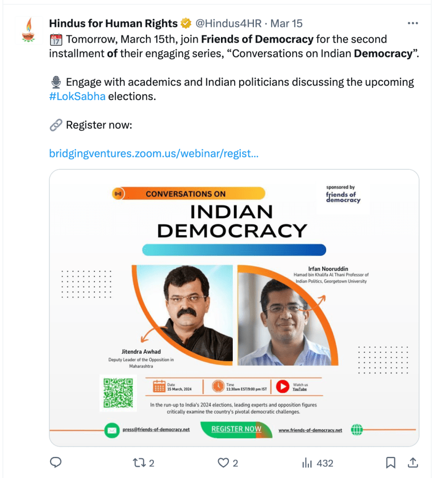 Irfan Nooruddin often fear mongers of non-existent Hindu majoritarianism to Western media. In a 2024 interview to America’s PBS he says “There has been a rising majoritarianism within the Indian population that has now really been manifested by the BJP, the ruling party.” He further goes on to say “…..200 million Muslims and another 50 million religious minorities are worried that at any given moment they might be attacked without any protection of the state machinery of law and order, the judicial system is one in which those citizens become second class citizens in their own country.”