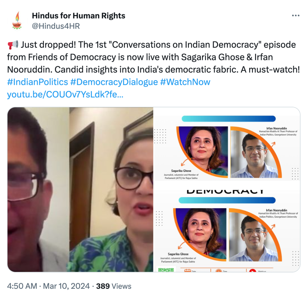 In 2024, in an interview to left-leaning France 24, Irfan Nooruddin while speaking on Indian PM Modi said “He has often and very successfully used anti-Muslim hate speech as a way of stoking his base. The party that he represents, the Bharatiya Janata Party, or the BJP, very proudly proclaims itself as a party of Hindu nationalism. They are outspoken in their demand and their desire, in their ambition to recreate India as a Hindu state, [to] abandon its traditional secular credentials that were part of the Indian constitution at independence in 1947.” He further goes on lie to the international audience that “…the BJP proudly proclaims as a party of Hindu nationalism, they are outspoken in their demand and in their desire and their ambition to create India, re-create India as a Hindu state abandoning its secular credentials that were part of the Indian Constitution at the time of independence in 1947.” India’s Constitution came into effect in 1947 and not 1950. The word secular was not part of the original constitution but was inserted much later in 1975 by the then Indian Prime Minister Indira Gandhi after the imposition of Emergency and while the entire opposition was in jail.