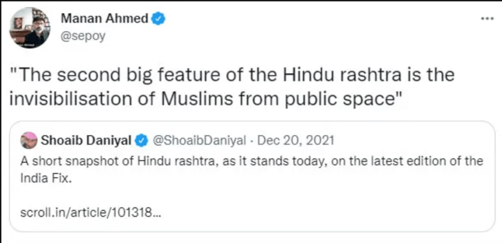 Co-authoring with Rohit Chopra and Audrey Truschke, North America Has a Hindu Nationalist Problem, and Scholars are On the Frontlines of These Right-Wing Attacks for the Religion Dispatches Manan Ahmed defends the need for Hindutva Harassment Field Manual to document “assaults on academic freedom” by far right groups and individuals who promote the political ideology of Hindutva, or Hindu nationalism.” They further write “Hindu nationalists……imagine the Indian past as an era of Hindu glory that was destroyed by despotic Muslim conquerors.” On the issue of California textbook controversy, the authors equate White supremacy with Hindu nationalism, “White supremacists and Hindu supremacists share a desire to discriminate without consequences.”