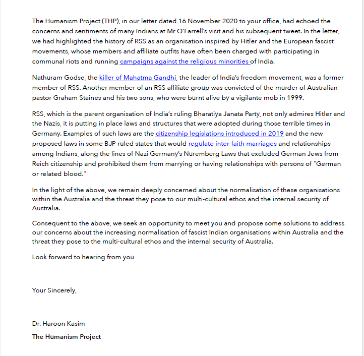 In January 2021, Kasim wrote a letter to Australian Prime Minister Scott Morrison complaining about waving of an orange flag by Hindus at the one day international cricket match between India and Australia. He called it “the flag on fascist organisation…. the RSS”. Click on picture to expand.