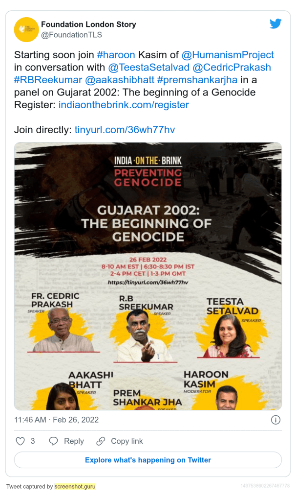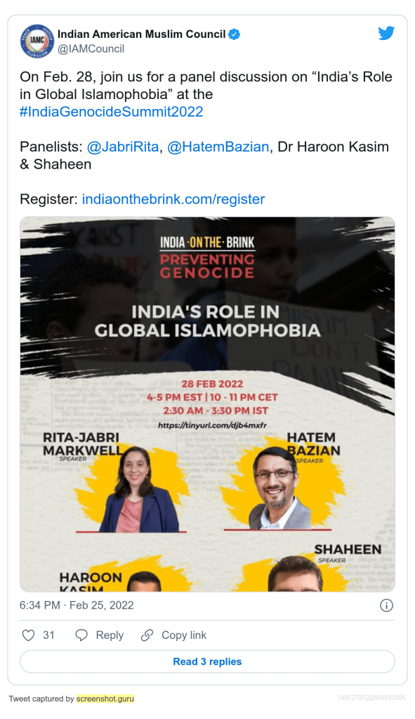 In 2022 February, Kasim was a participant in an anti-Hindu, anti-India online event “India on the Brink: Preventing Genocide“. The programme featured the usual suspects of Hindu hating politicians, ultra radical leftist, radical Christians, and Islamists. In the event he said “India stands on the brink of an impending genocide of Muslims.”