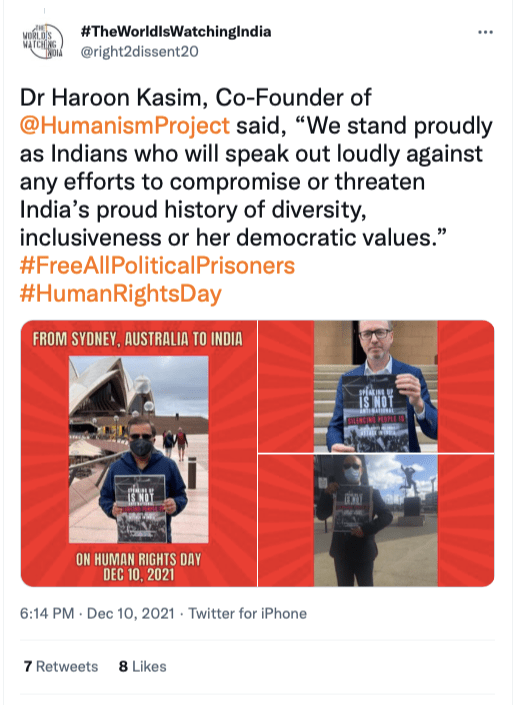 Mohammed Haroon Kasim is a Hospitalist at Hornsby Ku-ring-gai hospital, Sydeny, Australia. He is the founding member of Australian based anti-Hindu group, The Humanism Project. He is also a Kashmiri separatist. The Humanism Project is a part of a greater alliance Australian Alliance Against Hate and Violence (AAAHAV) which has Hindus for Human Rights, Khalistani separatist, Turbans 4 Australia, Australian Federation of Islamic Councils (AFIC), Pax Christi Australia, Basmala Australia and Indian Ambedkarite community.
