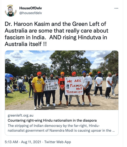 In the Vishal Jood case, Kasim, THP, the Greens Party, Turbans 4 Australia spread fake news and maligned Hindus in Australia while hiding the violence and instigation by Khalistanis. He often calls Hindus ‘a threat to Australia‘. Along with Greens party’s David Shoebridge, Kasim tried to bad-mouth Viswa Hindu Parishad (VHP) as terrorists in Australia. He called VHP a terror organisation that promotes Islamophobia to young Hindu children.