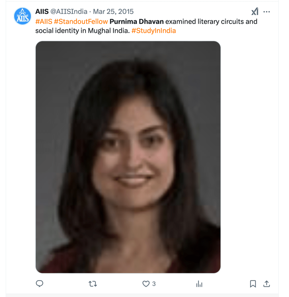 In 2021, Purnima Dhawan was a signatory of a letter in support of Audrey Truschke known for her attacks on Hindus and Hinduism. The letter called for a