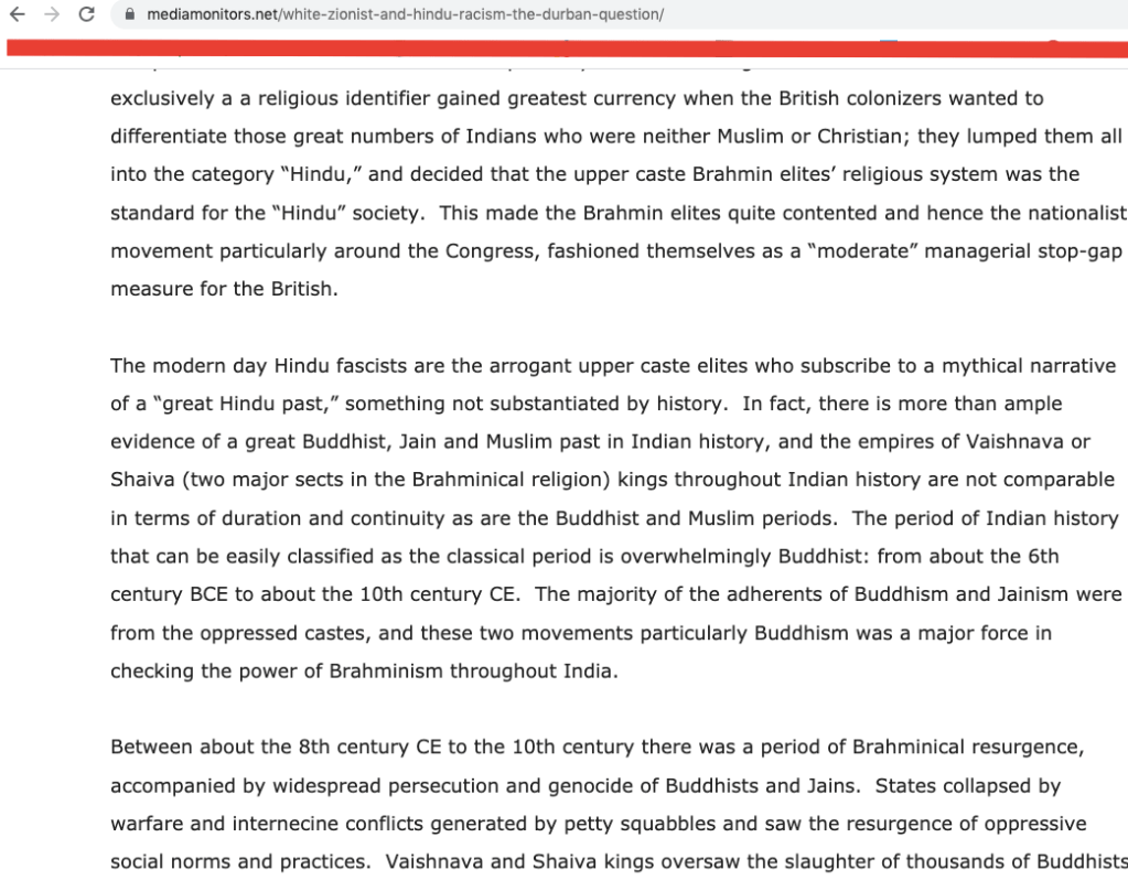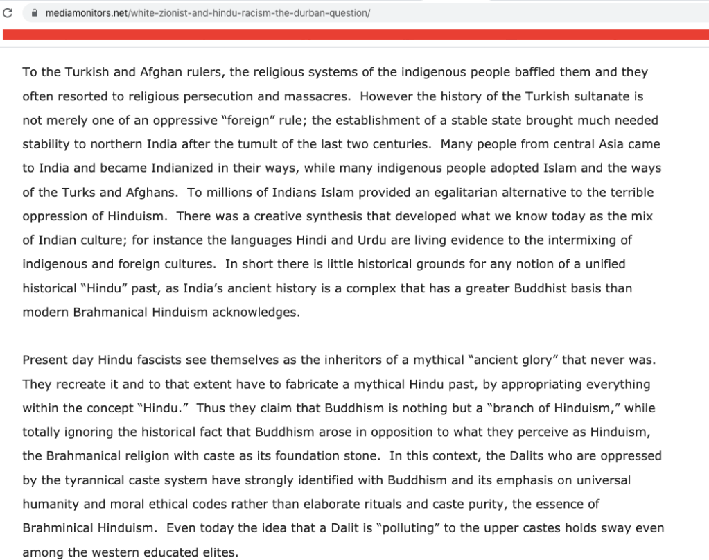 In an article penned by Raja Joseph titled White, Zionist, and Hindu Racism: The Durban Question, published on September 3, 2001 goes on a hate filled rant against Jews and Hindus – the two most historically persecuted religions. All the claims against Hindus is neither backed up by evidence nor facts, dismisses history that doesn’t suit his anti-Hindu narrative and ignores Hindu, Sikh and Buddhist genocide at the hands of Islamic invaders.