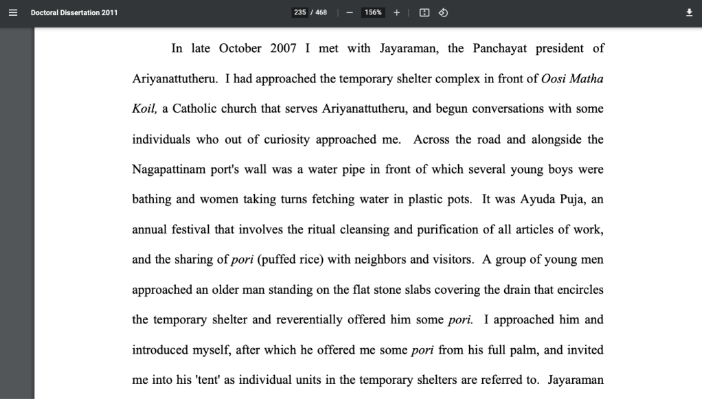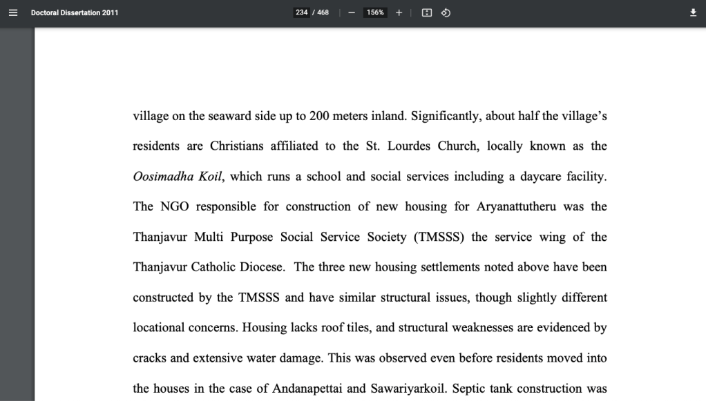 In his Doctoral dissertation presented at University of Texas, Austin in May 2011, Swamy looks into the relief efforts n Nagapattinam, Tamil Nadu of some national and international groups after the disastrous and destructive Tsunami of 2004. His dissertation was titled, DISASTER CAPITALISM:TSUNAMI RECONSTRUCTION AND NEOLIBERALISM IN