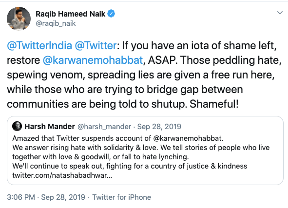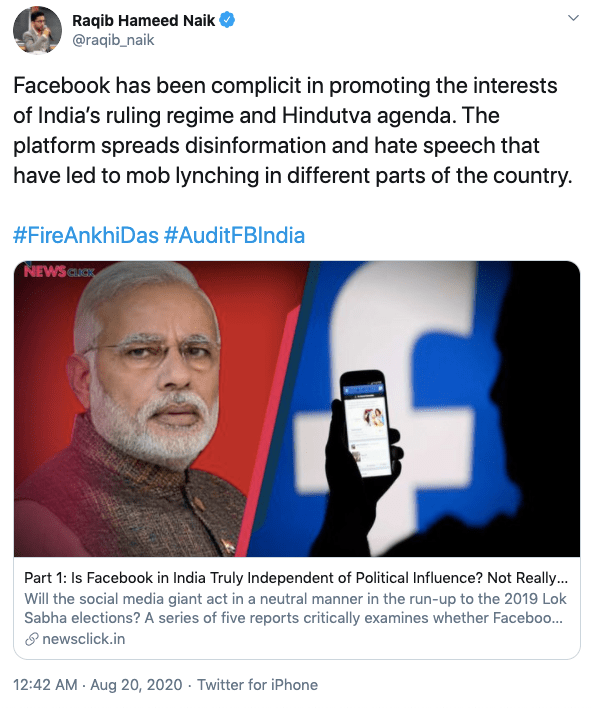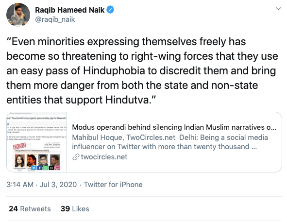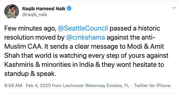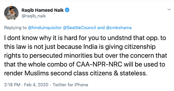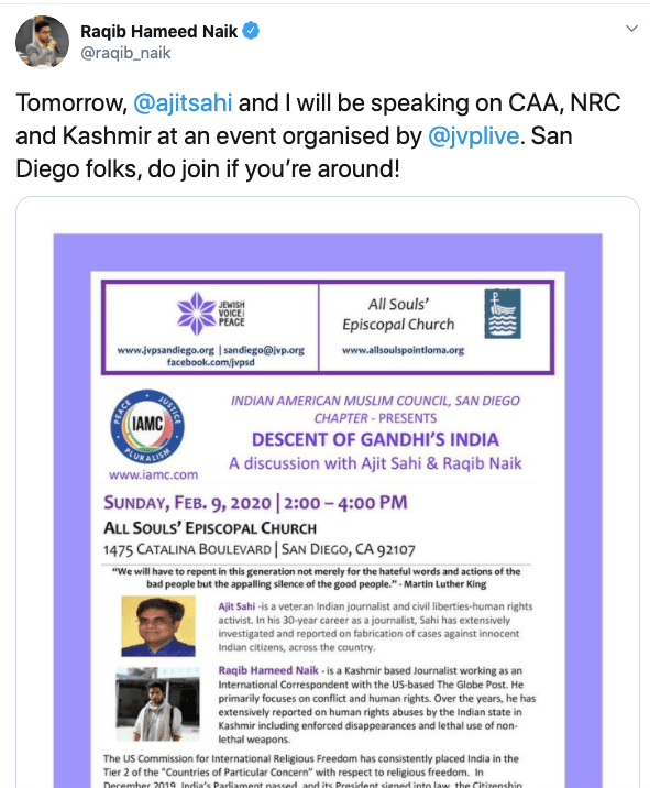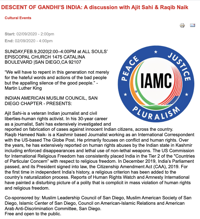 Raqib has often appeared in meetings, seminars, conferences organised by Indian American Muslim Council (IAMC), anti-India Emgage Action, Hindus for Human Rights (HfHR) and other anti-India, anti-Hindu organisations. Raqib appeared before the US Congressional briefing on Kashmir and against National Register of Citizens (NRC). In May 2020, Hindu forces came together to stop India’s Ministry of Tourism to release sponsorship payment for a Hinduphobic event organised by Harvard Kennedy School called “Being a Muslim in Contemporary India” where Raqib was a speaker. The other participants were Arfa Khanum Sherwani, Aman Wadud, Hussain Haidry.