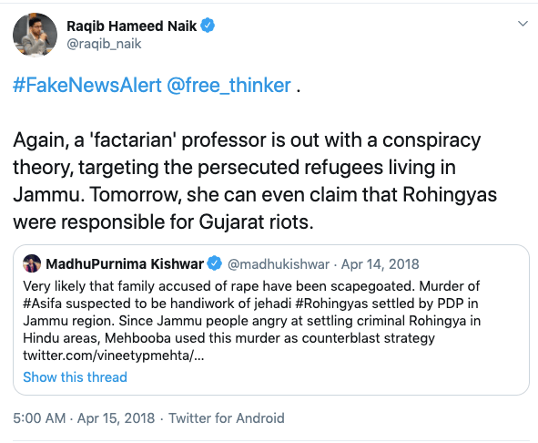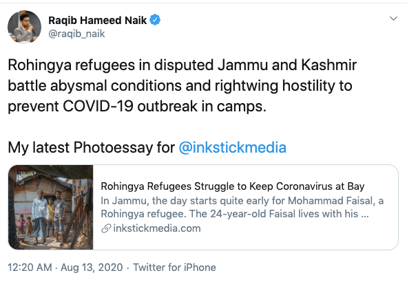 Raqib also has written against the construction of Bursar dam in Kashmir, a project that has been in the making since 2012. He has also argued in favour of illegal rohingyas in India and opposed their deportation. Rohingyas are known to have links violent extremist and terror outfits in the Indian sub-continent. In article for TRTworld.com which Raqib co-authored with Majid Maqbool, India’s far-right turns hostile toward Rohingya refugees argues “In Jammu City, Raina’s activism is another expression of the party’s anti-minority agenda. He has now turned his focus on Rohingya refugees, describing a few hundred of them as a demographic threat to the city’s Hindu majority population.” He lied about the number of Rohingyas as “a few hundred of them”, when in fact the actual number mentioned by Economic Times was 10,000 in 2017. Rohingyas in Myanmar are accused of massacre of 100’s of Hindus, as reported by Amnesty International. In a personal blogpost, Raqib has accused RSS of spoiling the relationship between Buddhists and Muslims in Ladakh region.