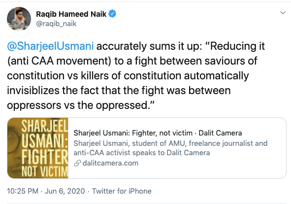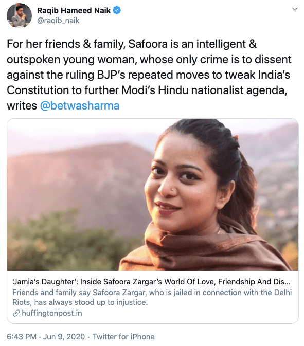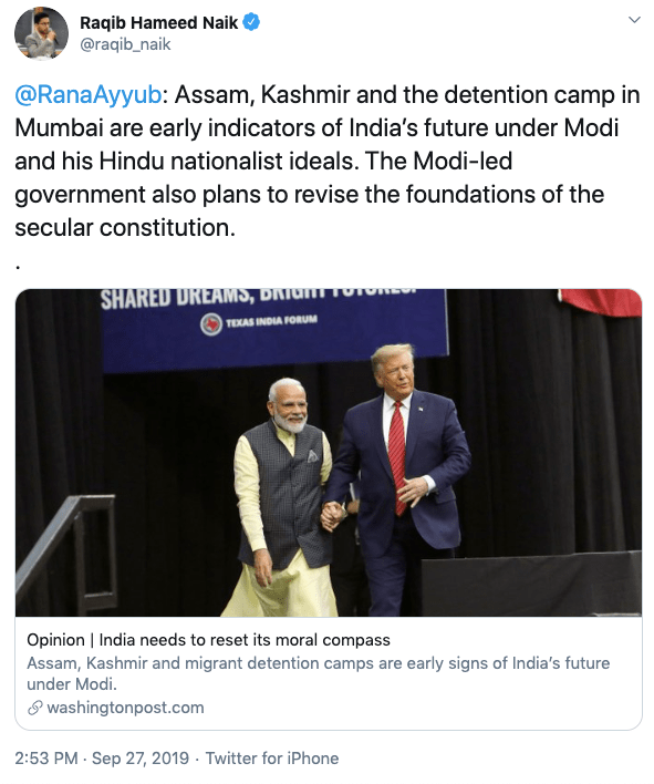 Raqib supports Kashmir separatism. He frequently addresses terrorists as ‘rebel-commanders‘ and addresses Kashmir as Indian-administered Kashmir and calls Kashmi “disputed”. He wrote an article titled ‘We Will Fight Till the End:’ Kashmir Reacts to India Rescinding Special Status in The Globepost and quoted only separatist voices like Shah Faesal, Shehla Rashid, academics cum Kashmiri separatists, Ather Zia and Ashok Swain, a known Hindu hater. Ather Zia is a professor in University of Northern Colorado and is associated with a dodgy organisation called Stand with Kashmir. Ashok Swain is known for his hatred shown towards RSS-BJP and is professor of hate and conflict in Uppsala University, Sweden.