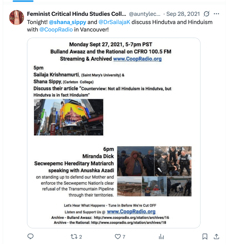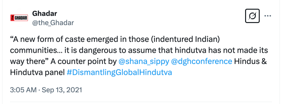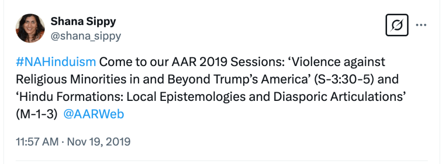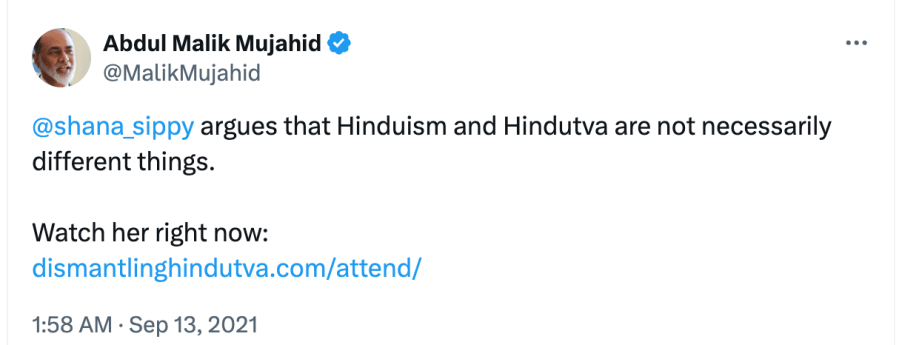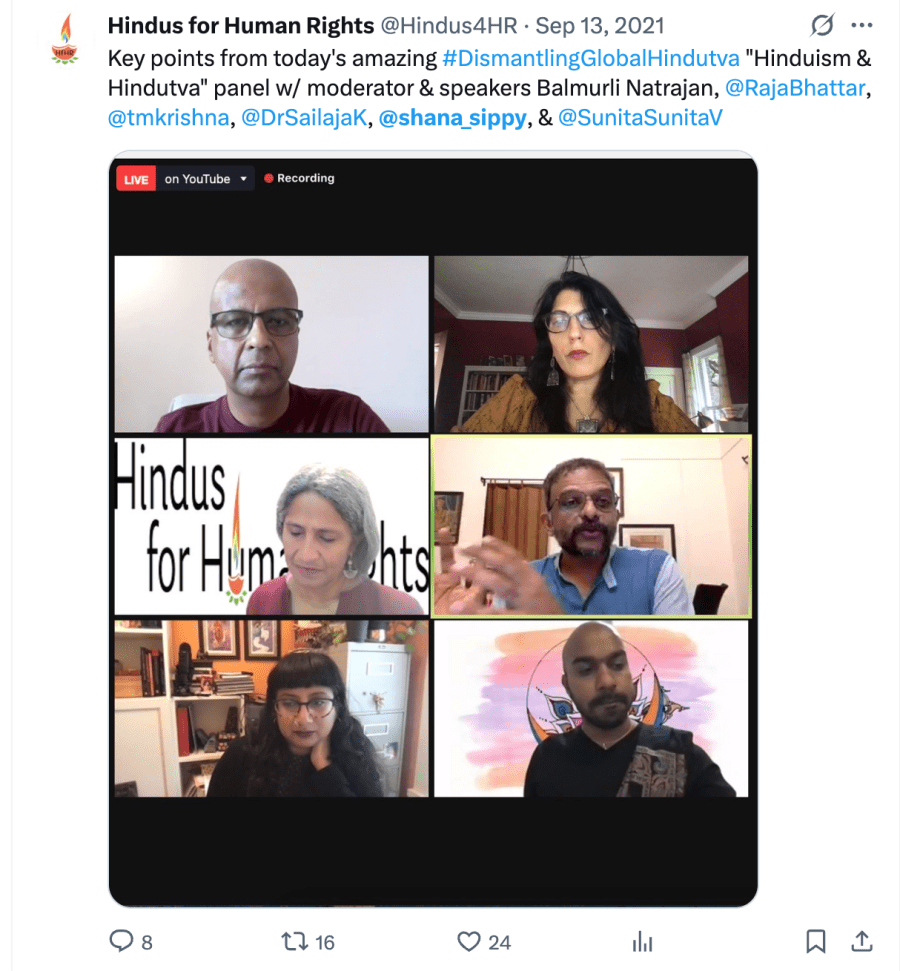 Shana Sippy was one of the speakers at the Dismantling Global Hindutva Conference where she said “Hinduism can take many forms uut we to understand the fact there is no Hindutva without Hinduism. Hindutva is inextricably linked to and is a form of Hinduism…….There is no way to dismantle Hindutva if you are going to ignore the Hinduism of it.”