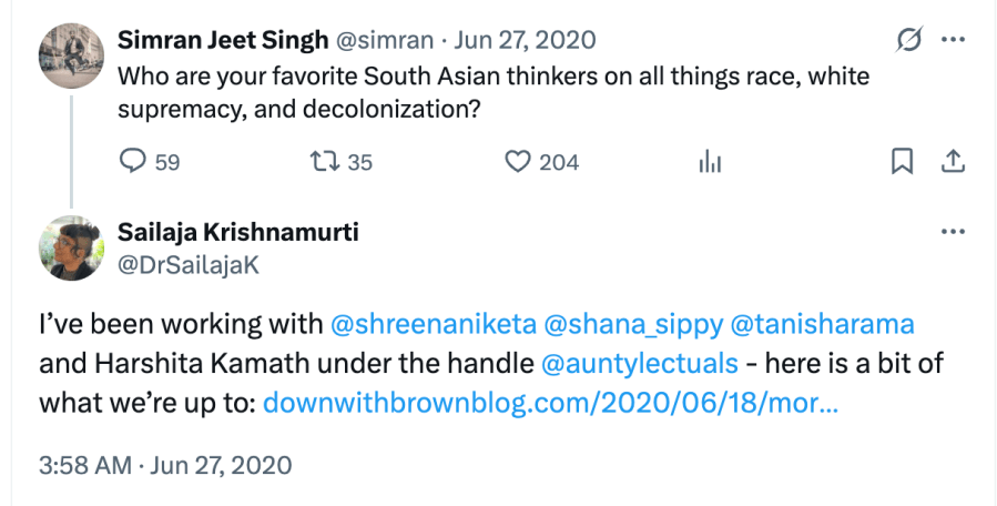 In their first article as Feminist Critical Hindu Studies Collective, “More than a Reading List: Challenging Anti-Black Racism in the Field of South Asian Religions“, Shana Sippy and others agree that any study of South Asian religions should “integrate gender and race” along with critical race theory, gender, and sexuality studies into their classes and research. They contend that the study of South Asian religions was formed by “white supremacy, brahminical supremacy, and hetero-patriarchy”. They write, “racism, anti-Blackness, sexism, casteism, Islamophobia, and orientalism inherently inform the scholarship on and pedagogy of South Asian religions.” Indians are perceived as “model minority” in the US which the authors believe the status is “rooted in anti-Black racism.”