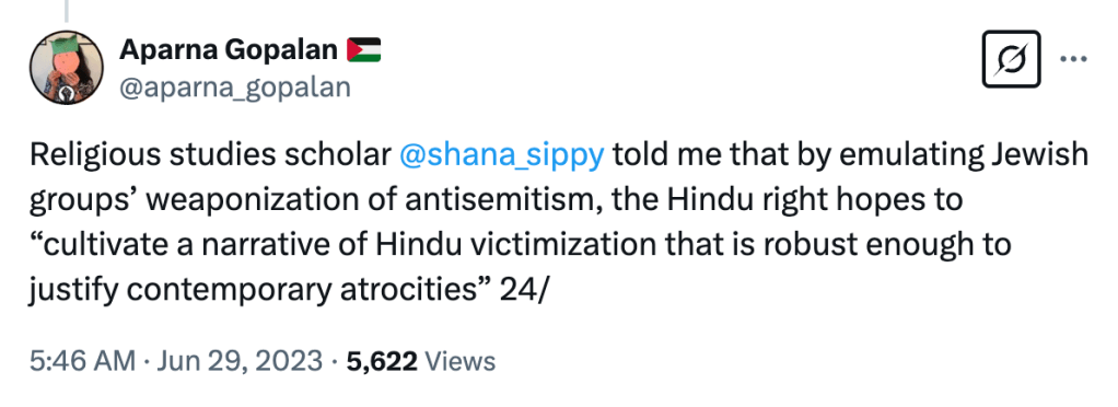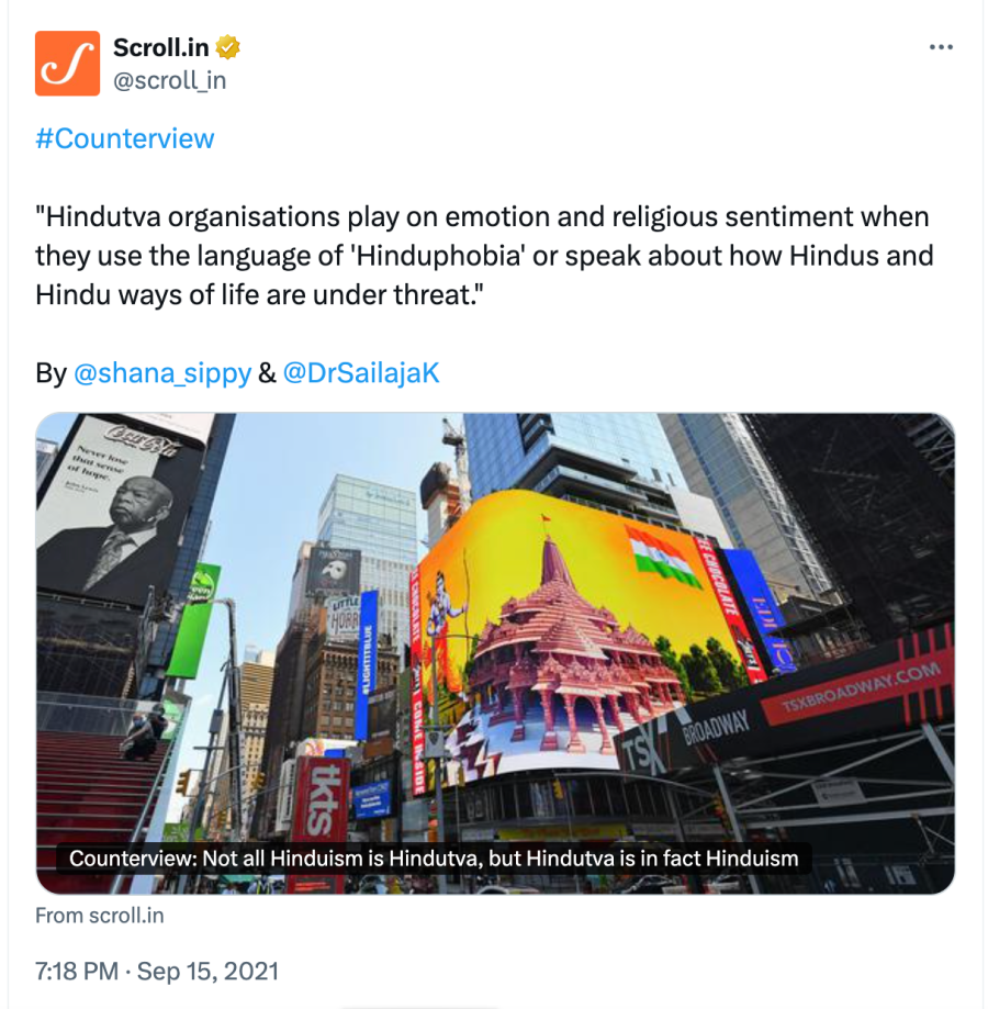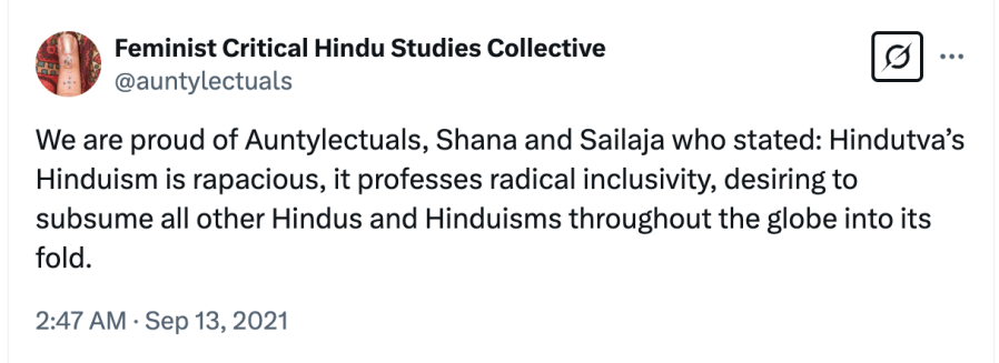 In a bizarre article co-authored with Sailaja Krishnamurthy, “Not all Hinduism is Hindutva, but Hindutva is in fact Hinduism” Shana Sippy writes, “We assert that although not all Hinduism is Hindutva, Hindutva is in fact Hinduism. We believe strongly that we must begin not by denying the Hinduness of Hindutva but by realising that Hindutva is a powerful, vocal, and insidious form of Hinduism.” On the issue that some global institutions and organisations wish to celebrate Hindu identity which according to them bolsters “Hindutva’s aims”. The authors argue that the notion of a Hindu identity “is a fairly recent construction that has been shaped by colonialism and nationalism” and that a Hindu identifying as Hindu signals “that one is not something else” which produces, “the hate that we see in Hindutva’s many forms.” Sippy and Krishnamurthy contend that Hinduphobia is a fabricated concept and a smokescreen for Hindutva, suggesting that the discrimination faced by Hindus in Western countries arises from being wrongly perceived as Muslims, hence they are victims of Islamophobia. The authors conclude by stating that to address the issue of Hindutva, “we must first recognise that Hindutva is indeed a part of Hinduism.”