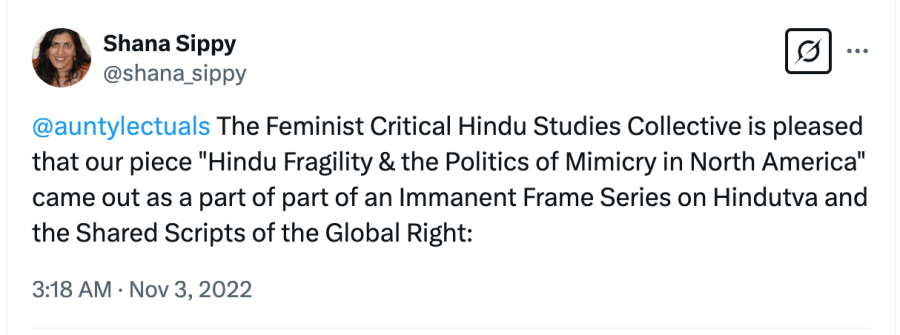Shana Sippy, as part of the Feminist Critical Hindu Studies Collective wrote an article “Hinduphobia is a smokescreen for Hindu nationalists” in which they write, “We became involved as organizers because we have privilege as American and Canadian citizens and as people who benefit from caste privilege.” They write that “Hindutva is a political movement that claims that only Hindus can be legitimate citizens of India, excluding India’s thriving Muslim, Dalit, Bahujan and Adivasi communities.” According to them, “There is little evidence that Hindus on university campuses face widespread religious persecution, and their use of “Hinduphobia” is little more than a smokescreen. The term co-opts the language we use as social justice activists to challenge racism, white supremacy, casteism and Islamophobia, even as Hindu nationalists claiming victim status troll and threaten South Asian studies and Hindu studies scholars. The term, and the violent rhetoric employed by Hindutva supporters, is built on misinformation and fear, which are classic tools of fascism everywhere.” They write that “challenging a casteist, Islamophobic way of being Hindu does not equate to Hinduphobia.”