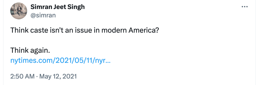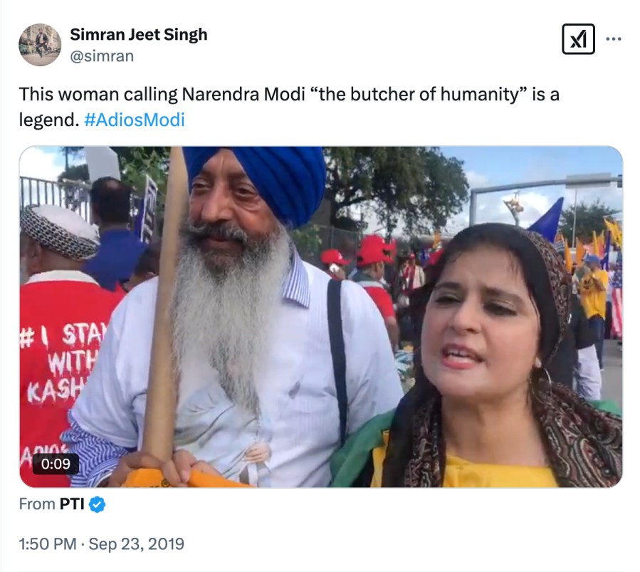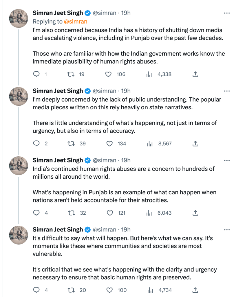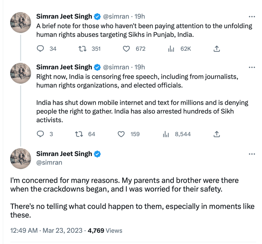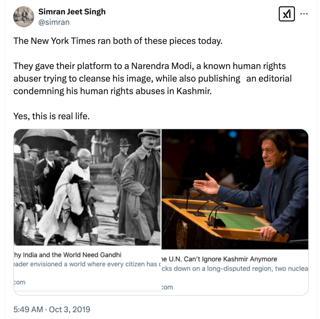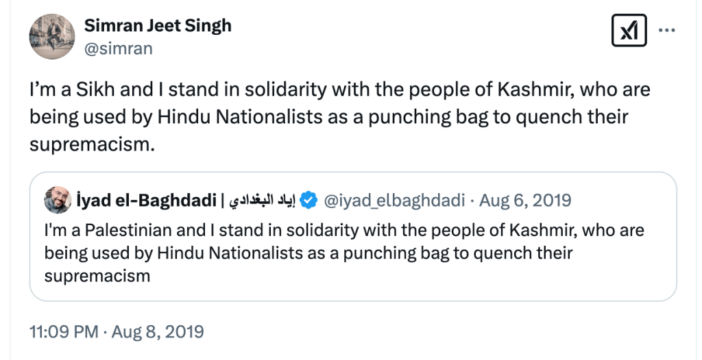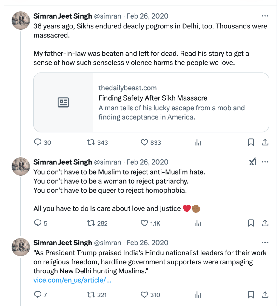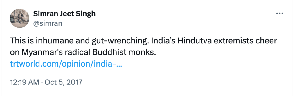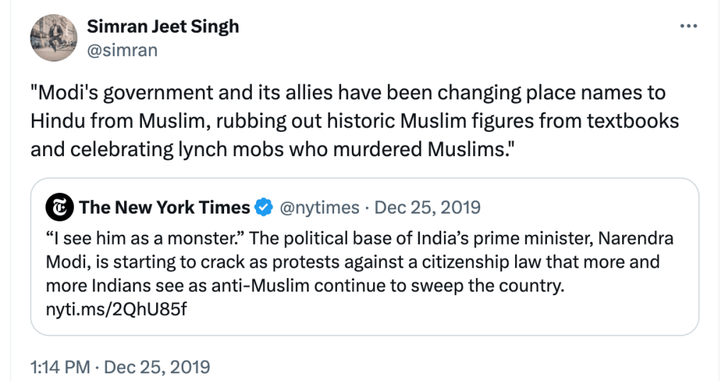 Simran Jeet Singh in a 2021 article “The Farmers’ Protests Are a Turning Point for India’s Democracy—and the World Can No Longer Ignore That“, calls “Islamic terrorism” a bogeyman that the “right-wing authoritarian” government of India used against the press. He whitewashed the history of the 1970s Punjab’s violent agitation for a separate Khalistan state as ” agitation….for better government support of agriculture.” He then said about Operation Bluestar, “Following a disinformation campaign, the government launched a series of attacks that resulted in mass atrocities and egregious human rights abuses.” As previously mentioned, Simran Jeet Singh doesn’t mention the 1985 Air India bombing nor the assassination of former Army Chief General A.S. Vaidya in London by Khalistani terrorists in 1986. He dismisses the atrocities committed by Khalistani terrorists against Hindus of Punjab as a “disinformation campaign”.