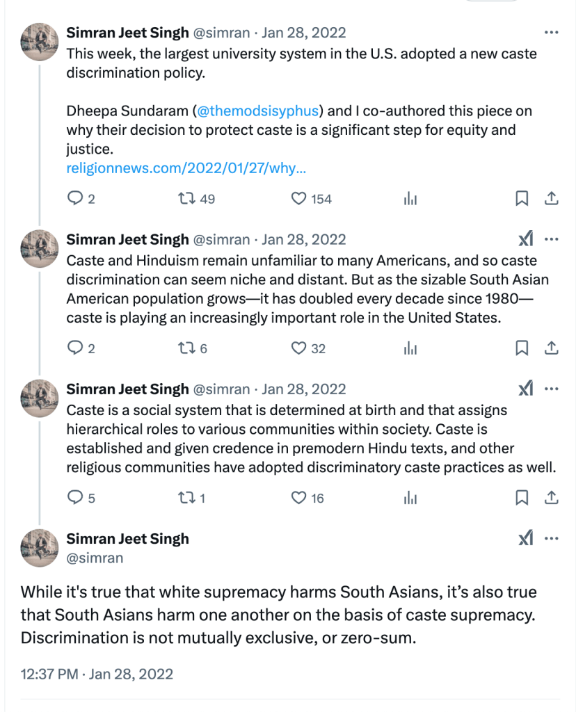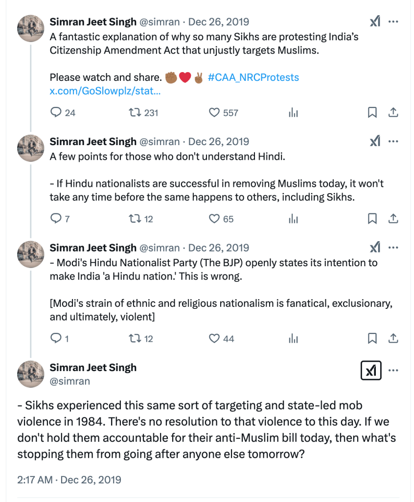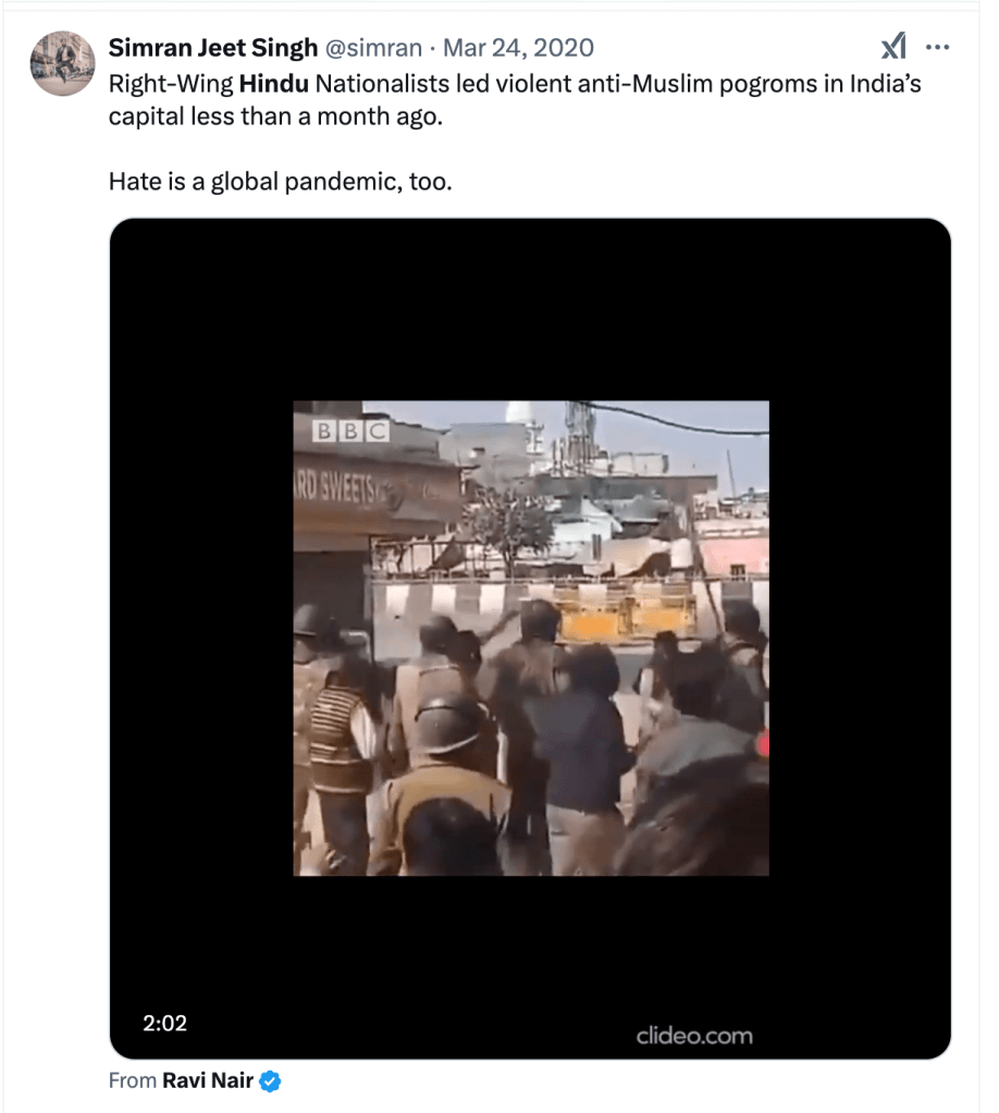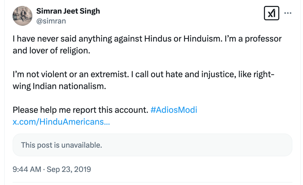 Simran Jeet Singh spreads disinformation and blatant lies through his article “Why Hindu nationalists are attacking Sikhs in Australia” published by Religionnews.com. He begins the article with a lie, calling the farmer’s protest “the largest protest in human history, according to several news outlets.” The news outlet and Simran Jeet Singh are incorrect. The farmer protest was by farmers in one state of India, Punjab. India has 28 states and 8 union territories. He further continues with the lies. In the piece on some Sikhs attacked in Australia during the farmer’s protest in India, he said, “Unlike most hate crimes that target Sikhs in the West, the attackers were not white supremacists or white nationalists; they were right-wing Indian nationalists terrorizing Sikhs in response to the protests against India’s new farm laws.” He gives the link to Australia’s Channel 7 as evidence of attack. The Australian news report mentions that the police were investigating the identity of the attackers and the cause for attacking Sikhs in Sydney’s Harris Park. Simran Jeet Singh without evidence, blames it on “Hindu nationalists” even though Australian police hadn’t identified the attackers.