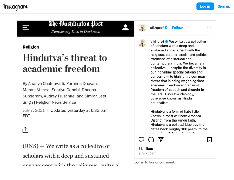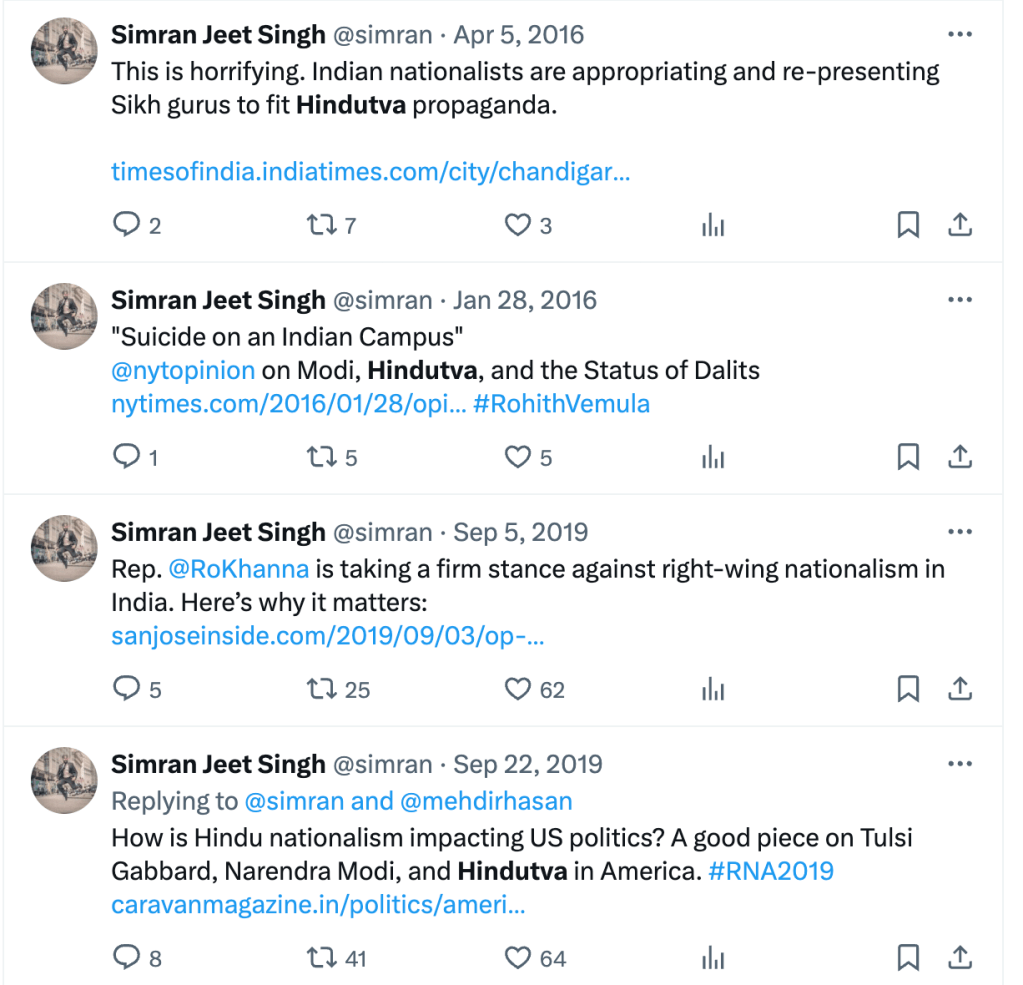 In “Hindutva’s threat to academic freedom” Simran Jeet Singh, as part of SASAC, calls for the recognition of Hindutva as a political hate ideology that is distinct from Hinduism. He argues that Hindutva has “been instrumental in transforming India’s once pluralistic and secular democracy into an ethnonationalist state defined by Hindu supremacy and human rights violations.” The authors unwittingly agree that they want to gate-keep India’s history, preventing Hindus from seeking out India’s true history. “Such hate seeks to undermine our genuine, nuanced research, which presents a vision of South Asian history, religions and cultures as multifaceted and pluralistic. Our scholarship undercuts Hindutva’s project to remake India and Indian history.”