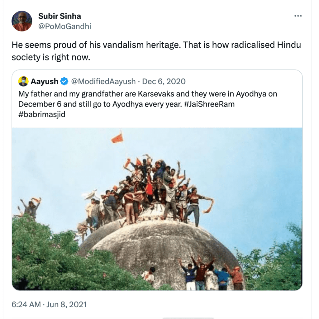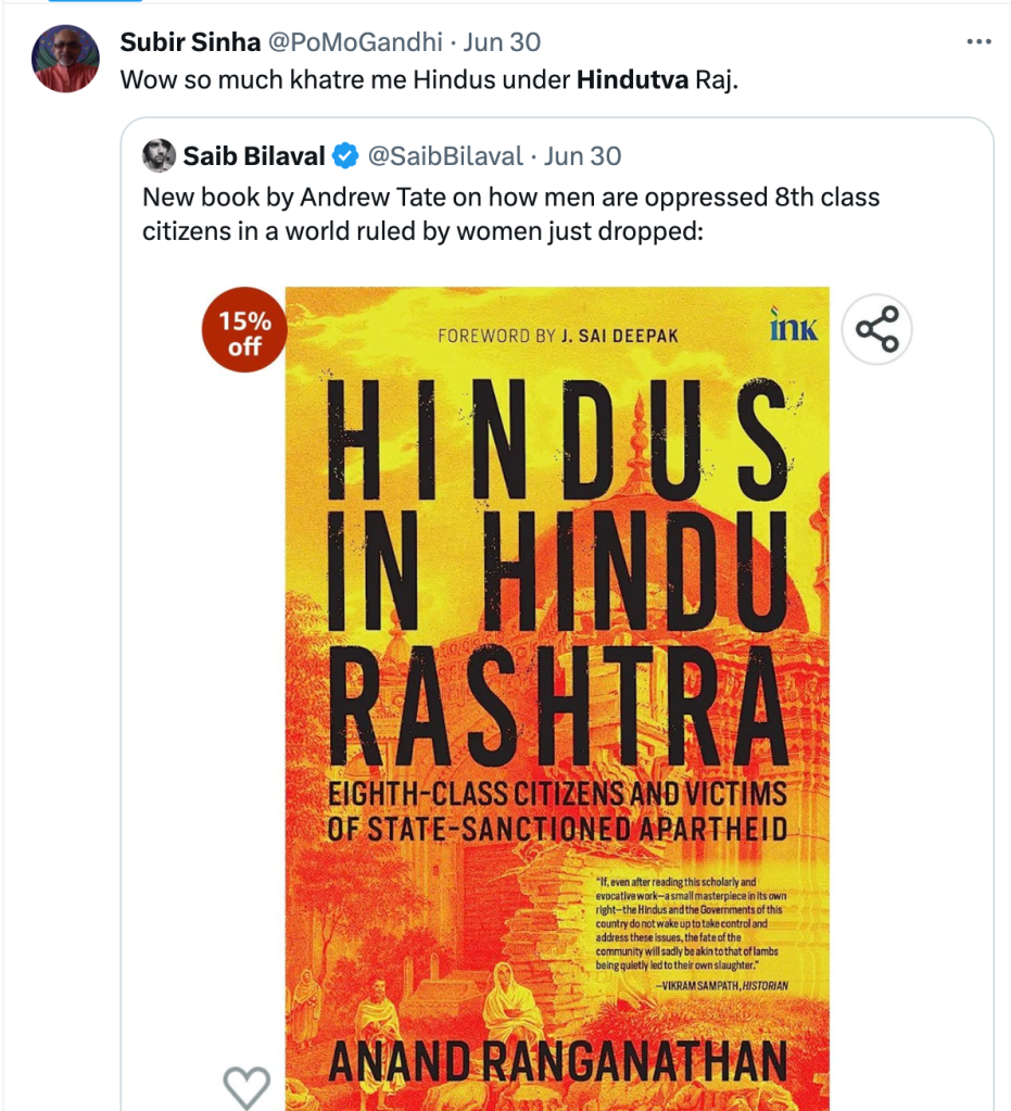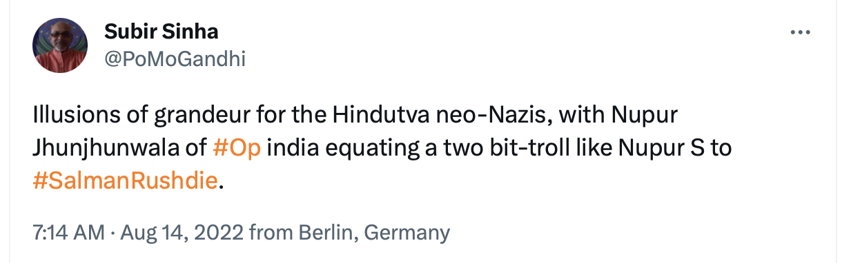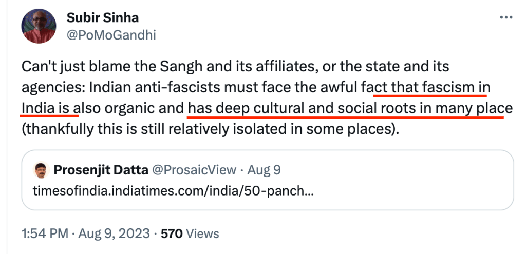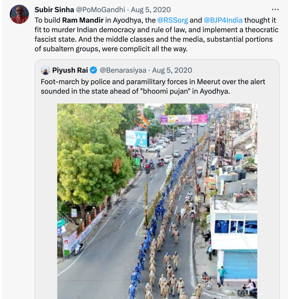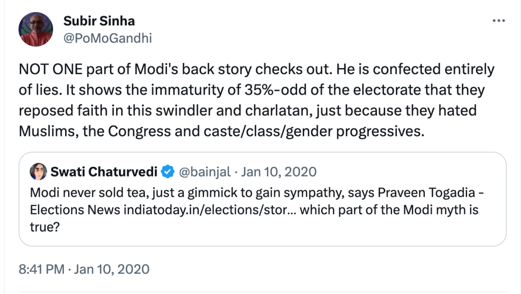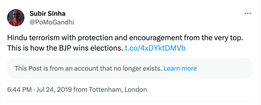 In 2022, Subir Sinha wrote “Modi’s ‘people’ and populism’s imagined communities” where he ridicules the millions of Hindus slaughtered, raped and forcibly converted by Islamic invaders as “…meme of a ‘Hindu holocaust’…. “. The entire piece is riddled with claims not backed up by data or evidence, complete lies and utter contempt for Hindus.