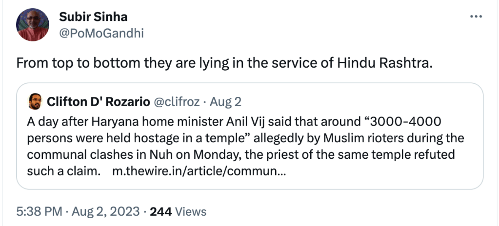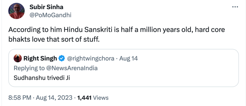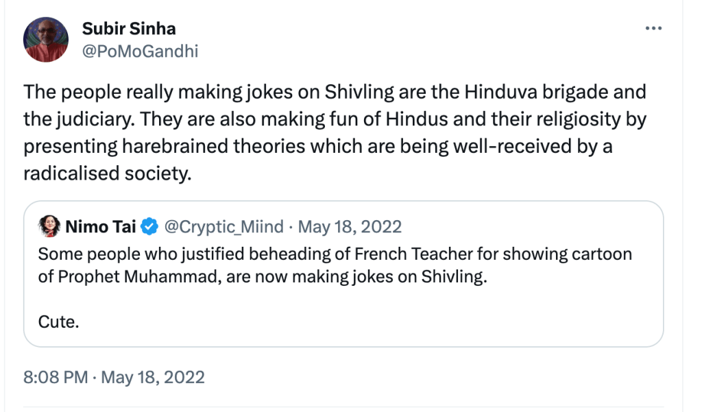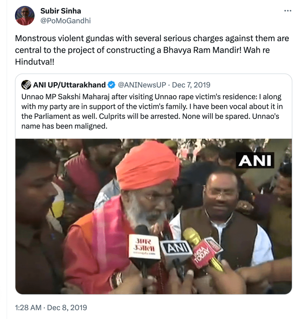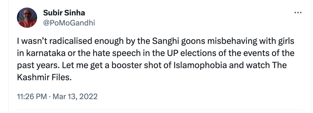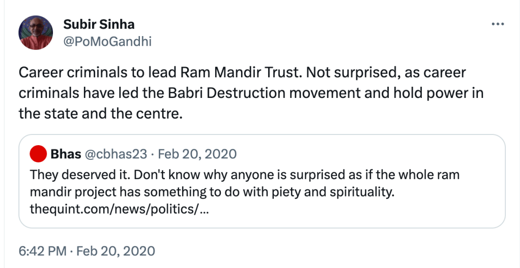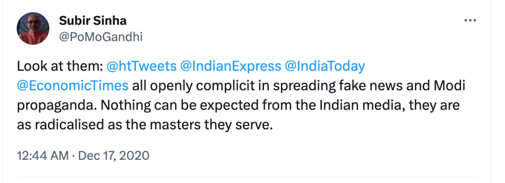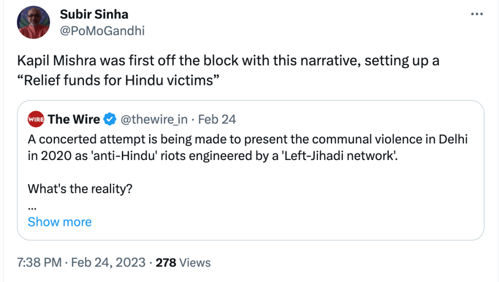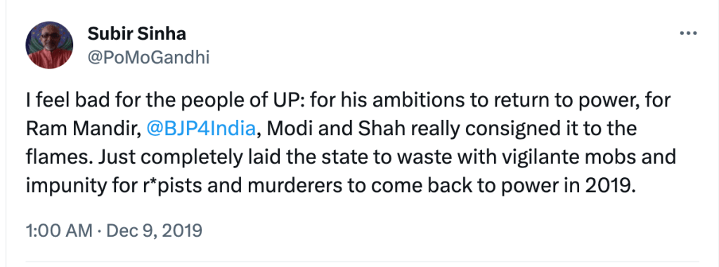 In 2022, Subir Sinha wrote “Modi’s ‘people’ and populism’s imagined communities” where he ridicules the millions of Hindus slaughtered, raped and forcibly converted by Islamic invaders as “…meme of a ‘Hindu holocaust’…. “. The entire piece is riddled with claims not backed up by data or evidence, complete lies and utter contempt for Hindus.