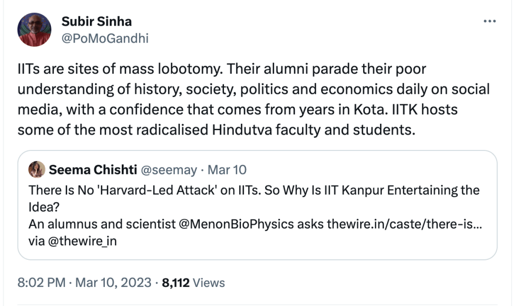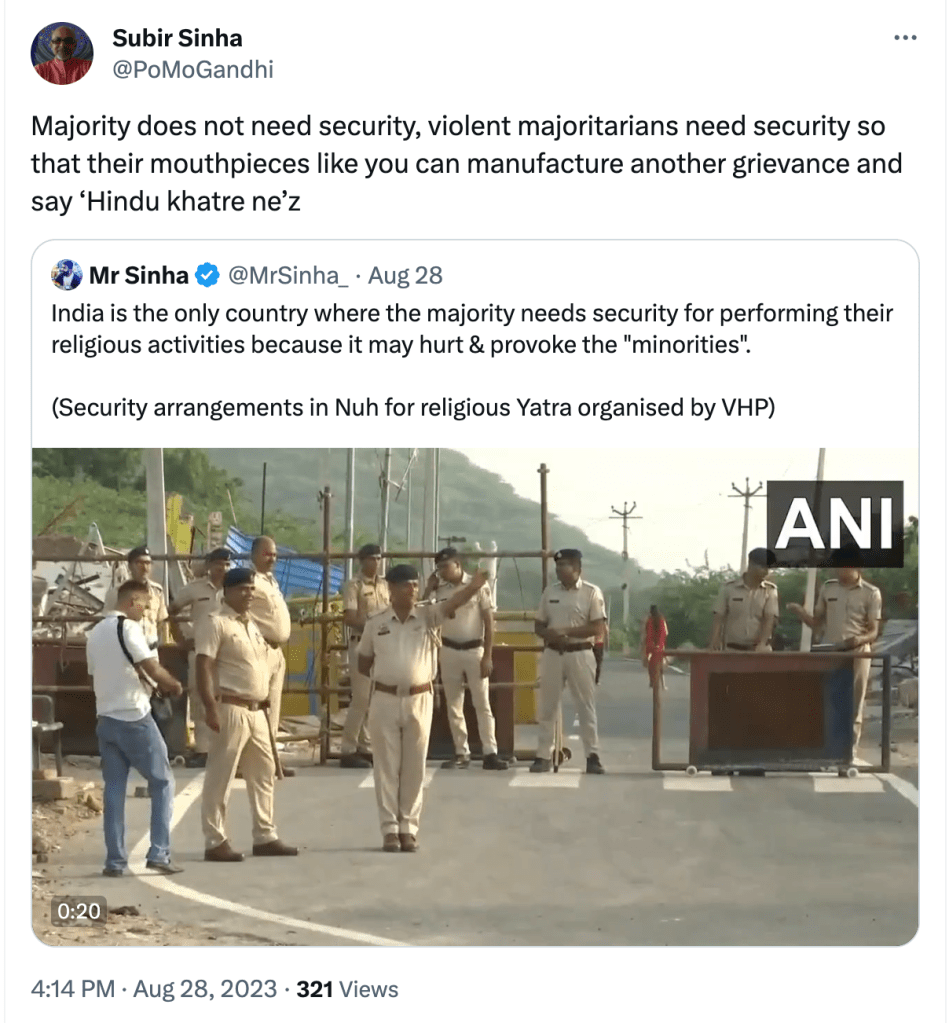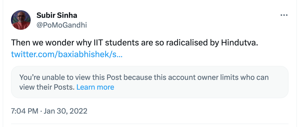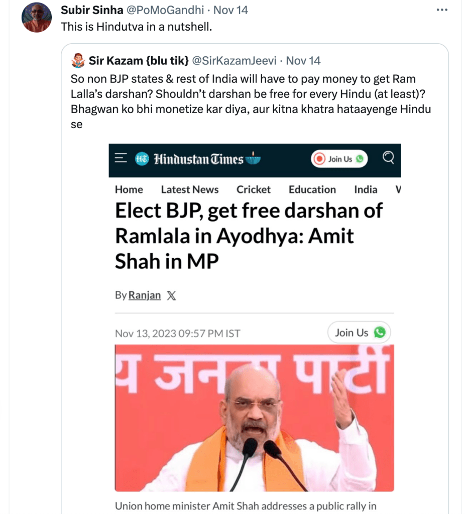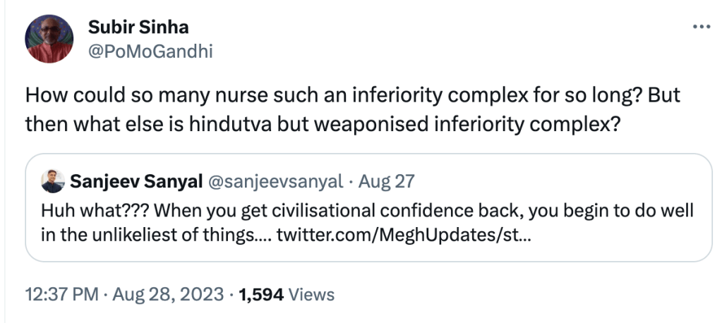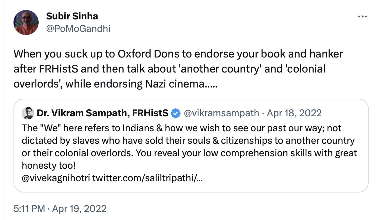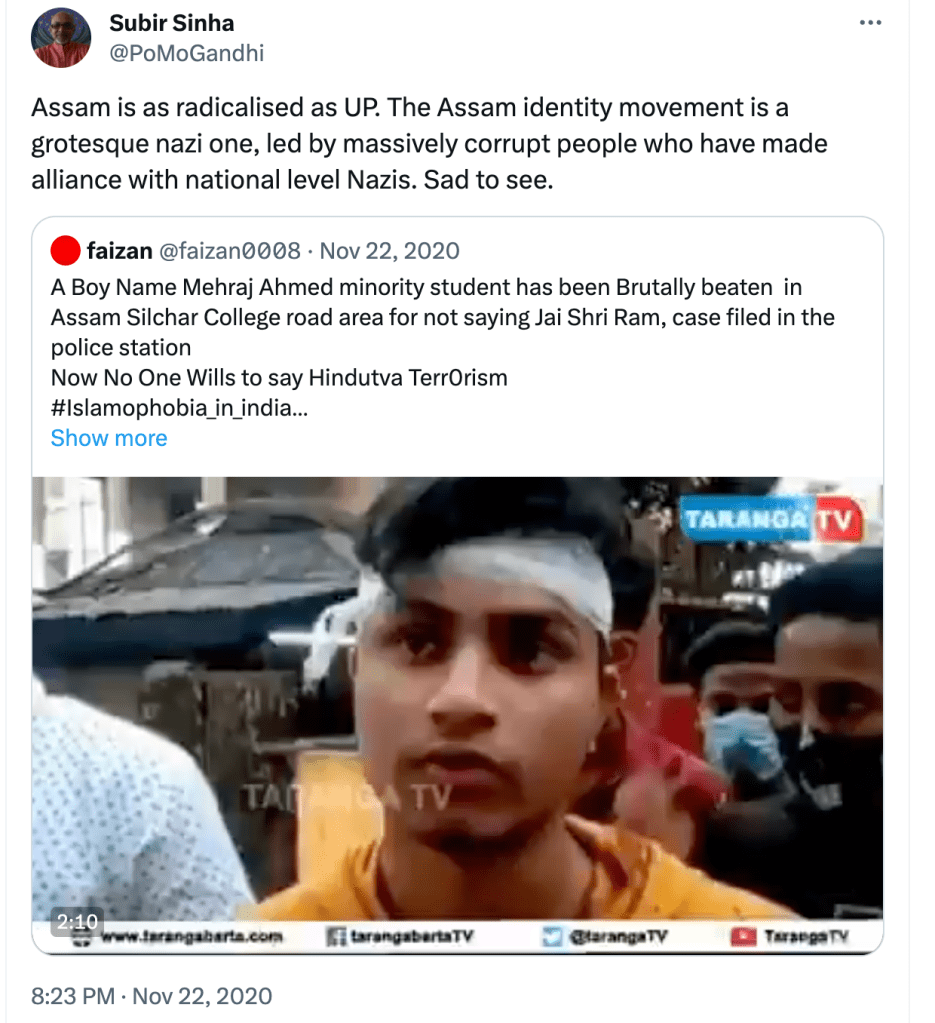 In 2022, Subir Sinha wrote “Modi’s ‘people’ and populism’s imagined communities” where he ridicules the millions of Hindus slaughtered, raped and forcibly converted by Islamic invaders as “…meme of a ‘Hindu holocaust’…. “. The entire piece is riddled with claims not backed up by data or evidence, complete lies and utter contempt for Hindus.