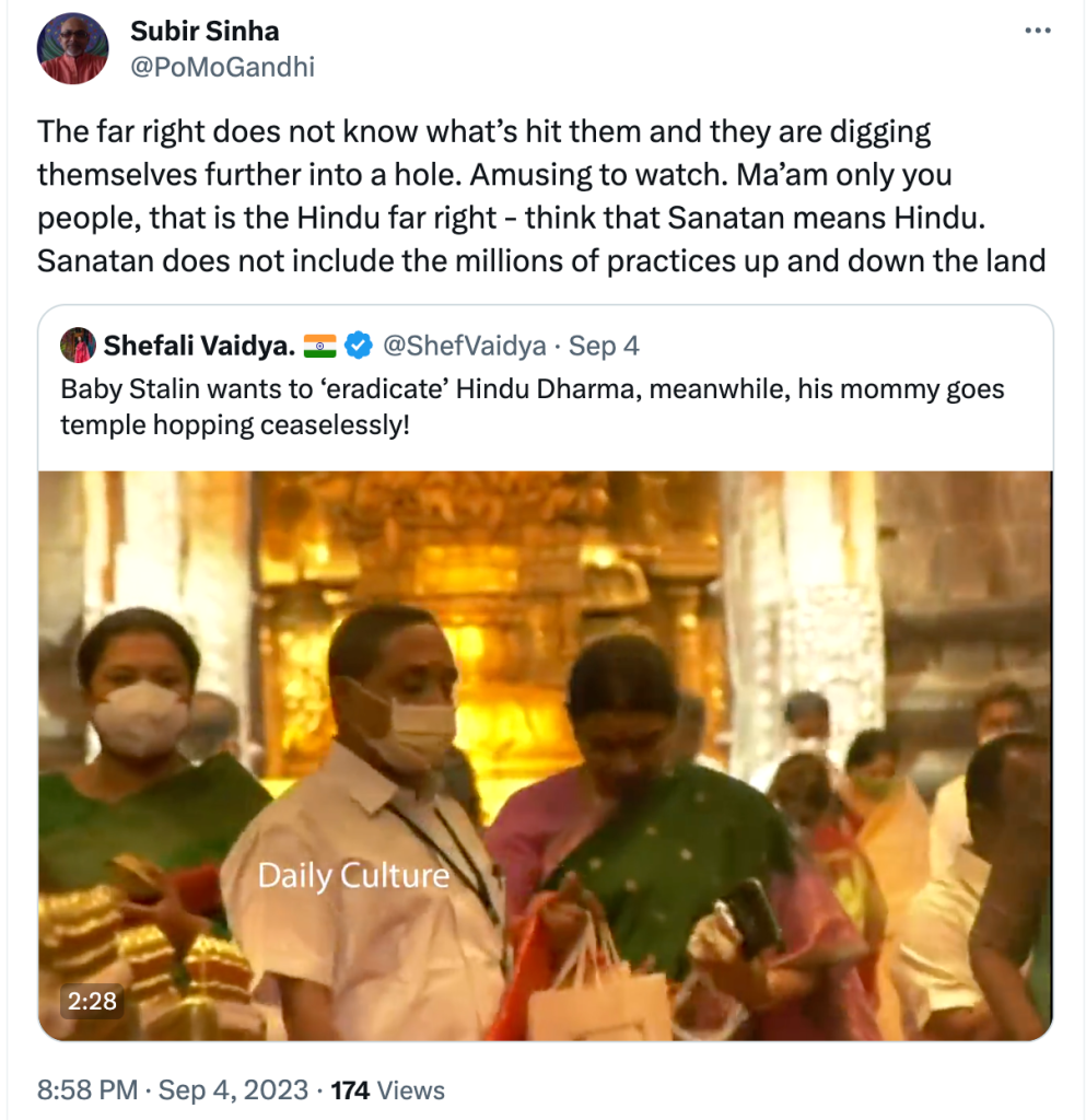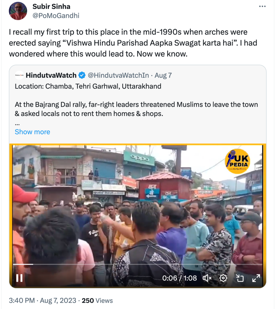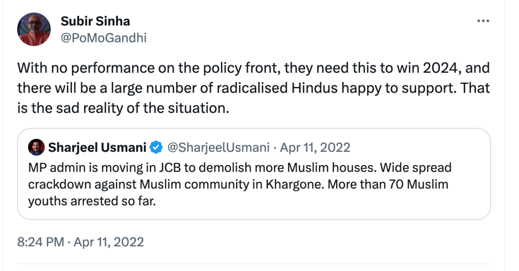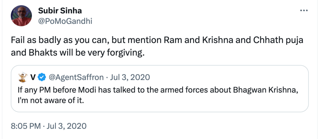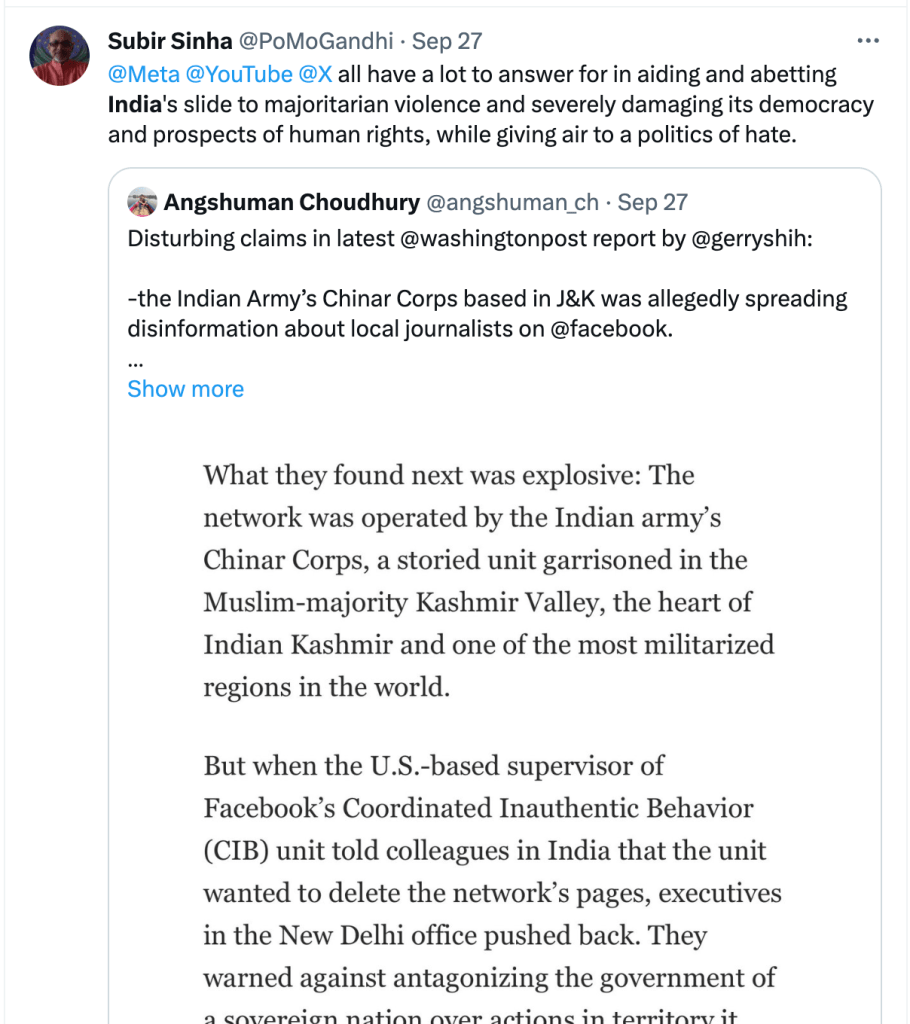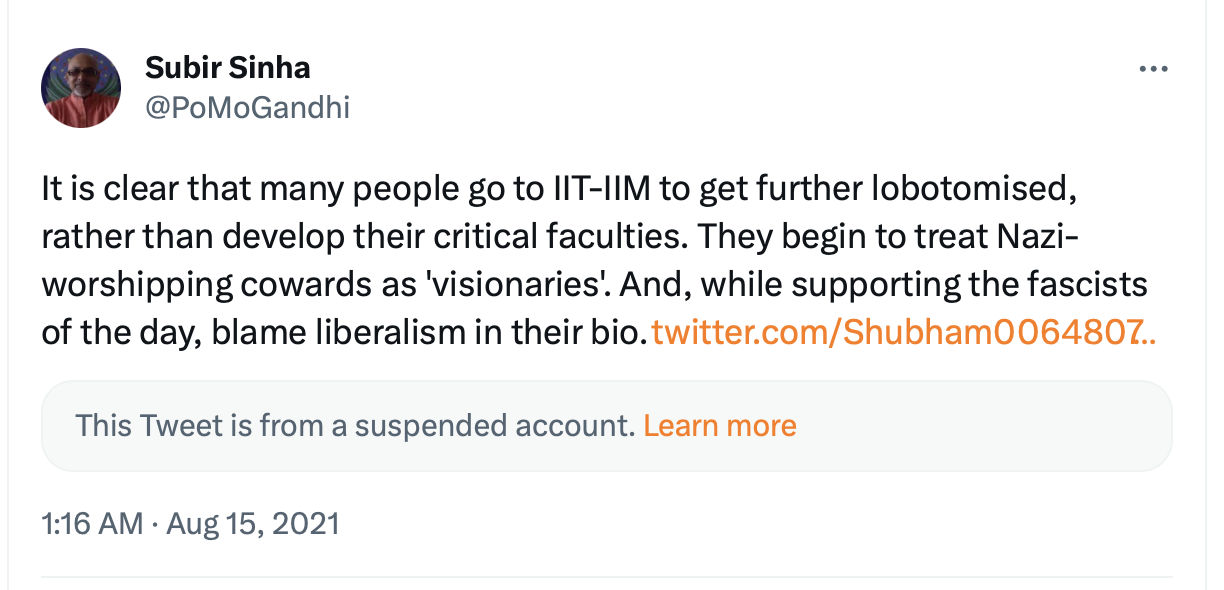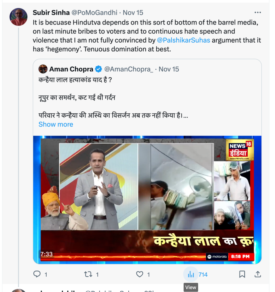 In 2022, Subir Sinha wrote “Modi’s ‘people’ and populism’s imagined communities” where he ridicules the millions of Hindus slaughtered, raped and forcibly converted by Islamic invaders as “…meme of a ‘Hindu holocaust’…. “. The entire piece is riddled with claims not backed up by data or evidence, complete lies and utter contempt for Hindus.