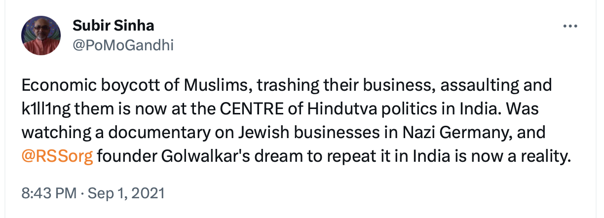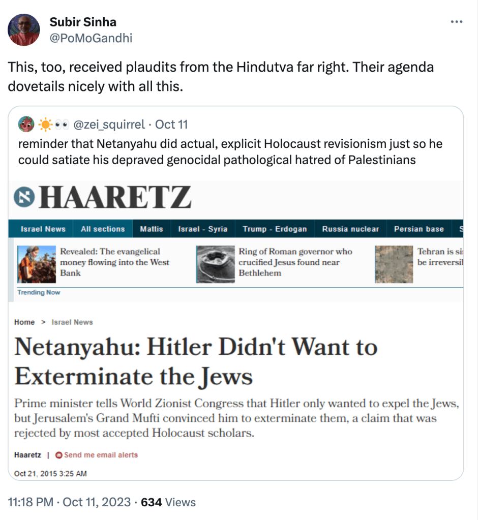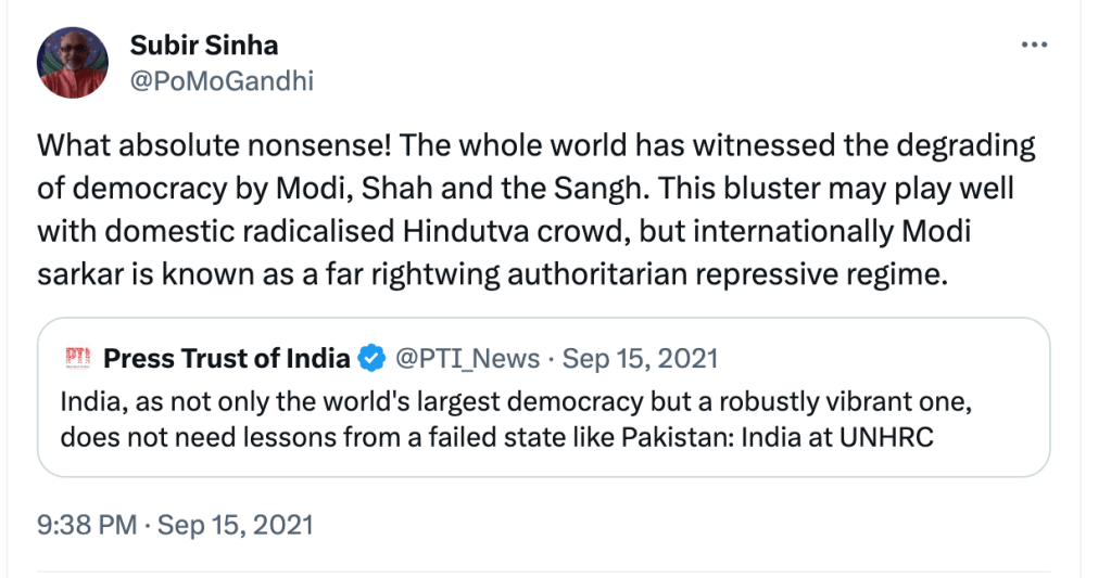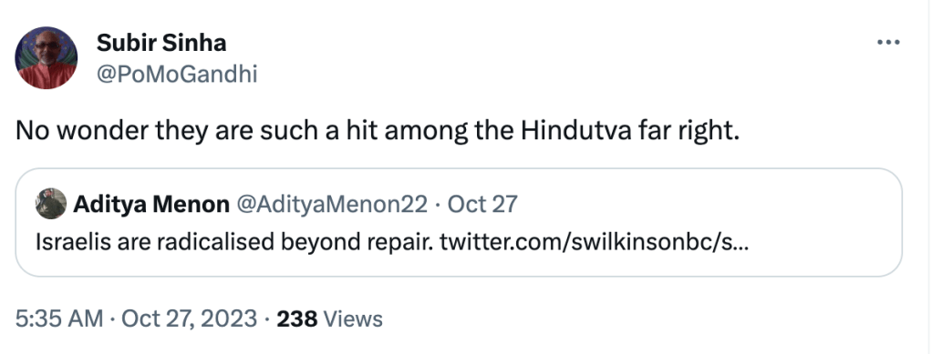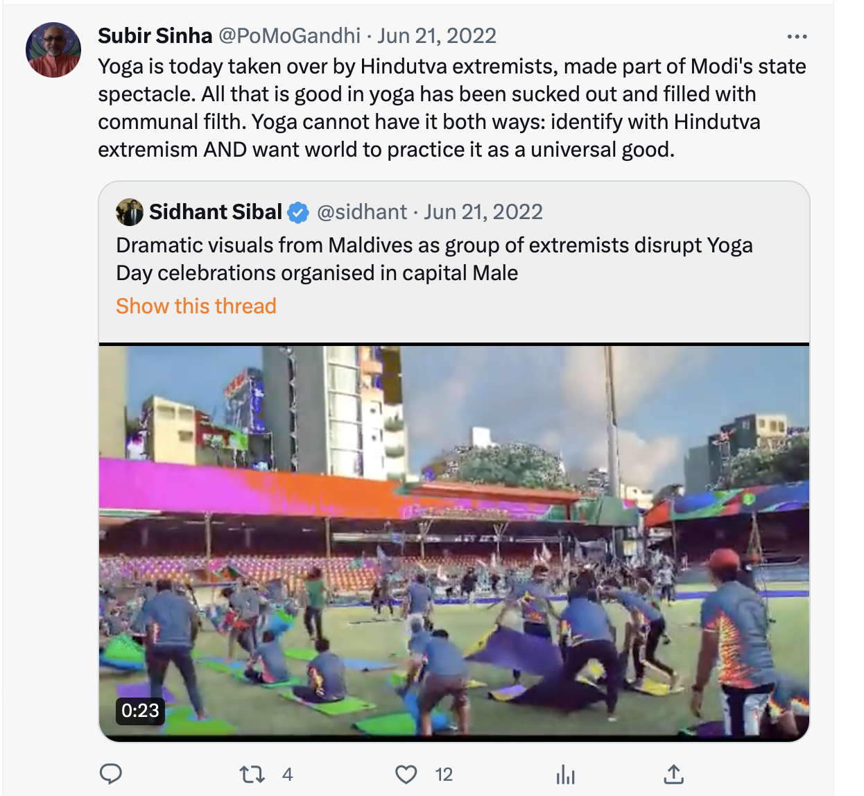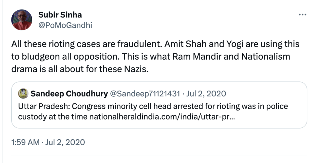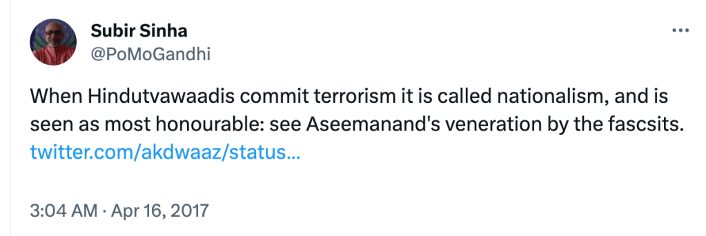 Dr. Subir Sinha, like other leftist-Islamist, often compares Hindus with Jews, calling Hindus as Hindutva and Jews as Zionists. He even went as far to call Yoga as “identified with Hindutva”. Dr.Sinha is very fond of comparing Hindus to the Nazis. In a twitter post Dr.Sinha wrote “India is the most advance Nazi society in the world right now.”