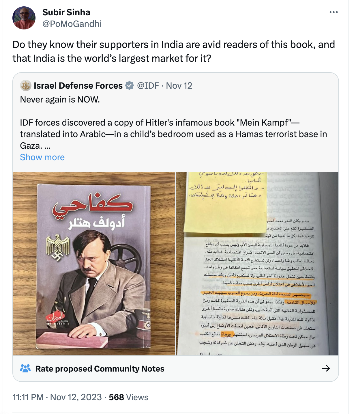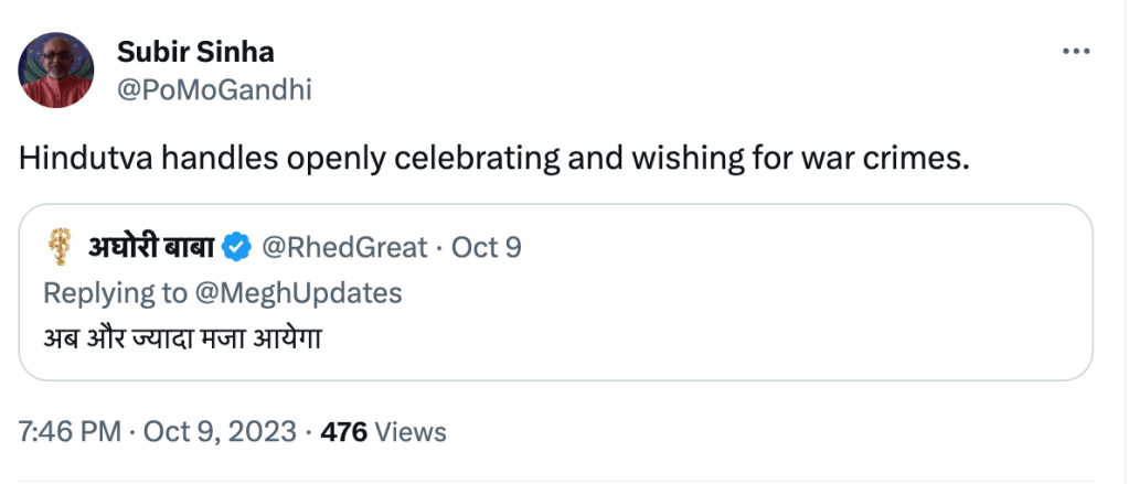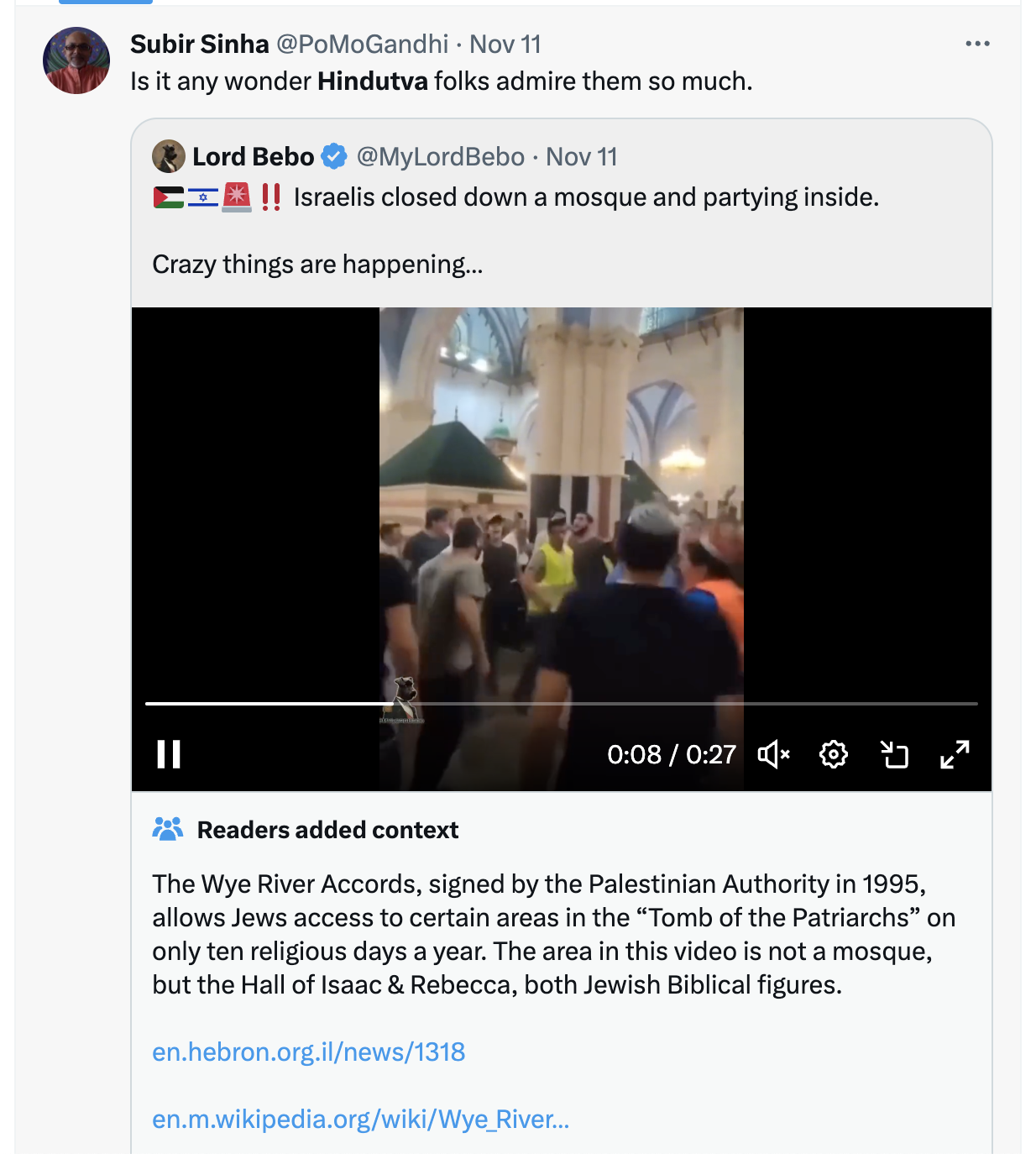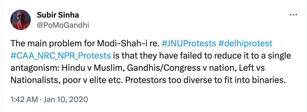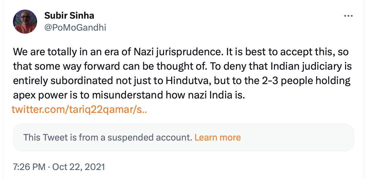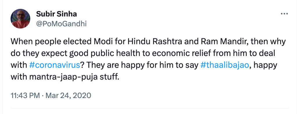 Dr. Subir Sinha, like other leftist-Islamist, often compares Hindus with Jews, calling Hindus as Hindutva and Jews as Zionists. He even went as far to call Yoga as “identified with Hindutva”. Dr.Sinha is very fond of comparing Hindus to the Nazis. In a twitter post Dr.Sinha wrote “India is the most advance Nazi society in the world right now.”