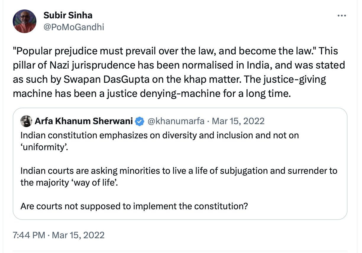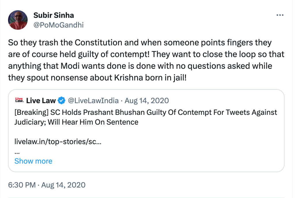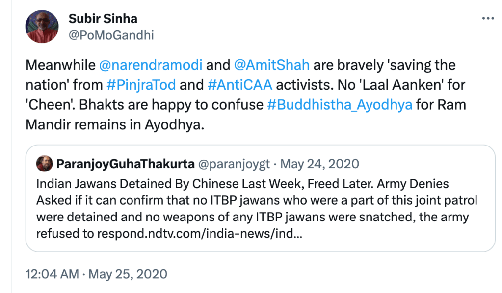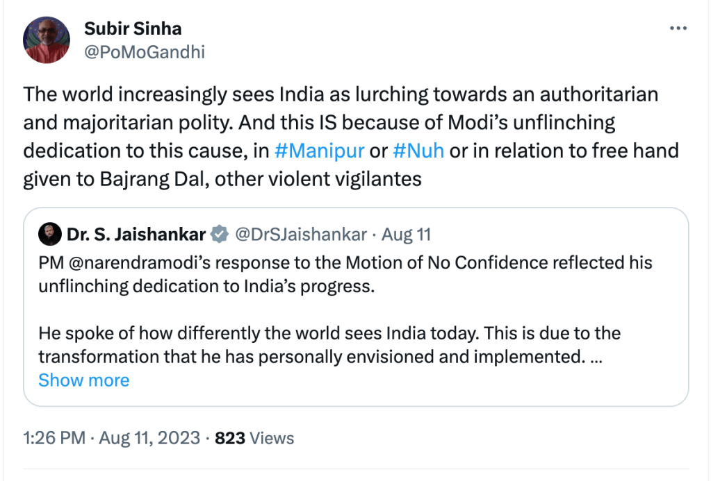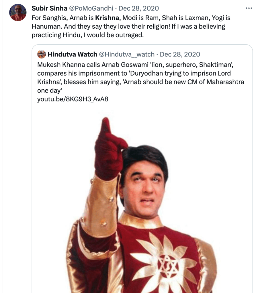 Dr. Subir Sinha, like other leftist-Islamist, often compares Hindus with Jews, calling Hindus as Hindutva and Jews as Zionists. He even went as far to call Yoga as “identified with Hindutva”. Dr.Sinha is very fond of comparing Hindus to the Nazis. In a twitter post Dr.Sinha wrote “India is the most advance Nazi society in the world right now.”