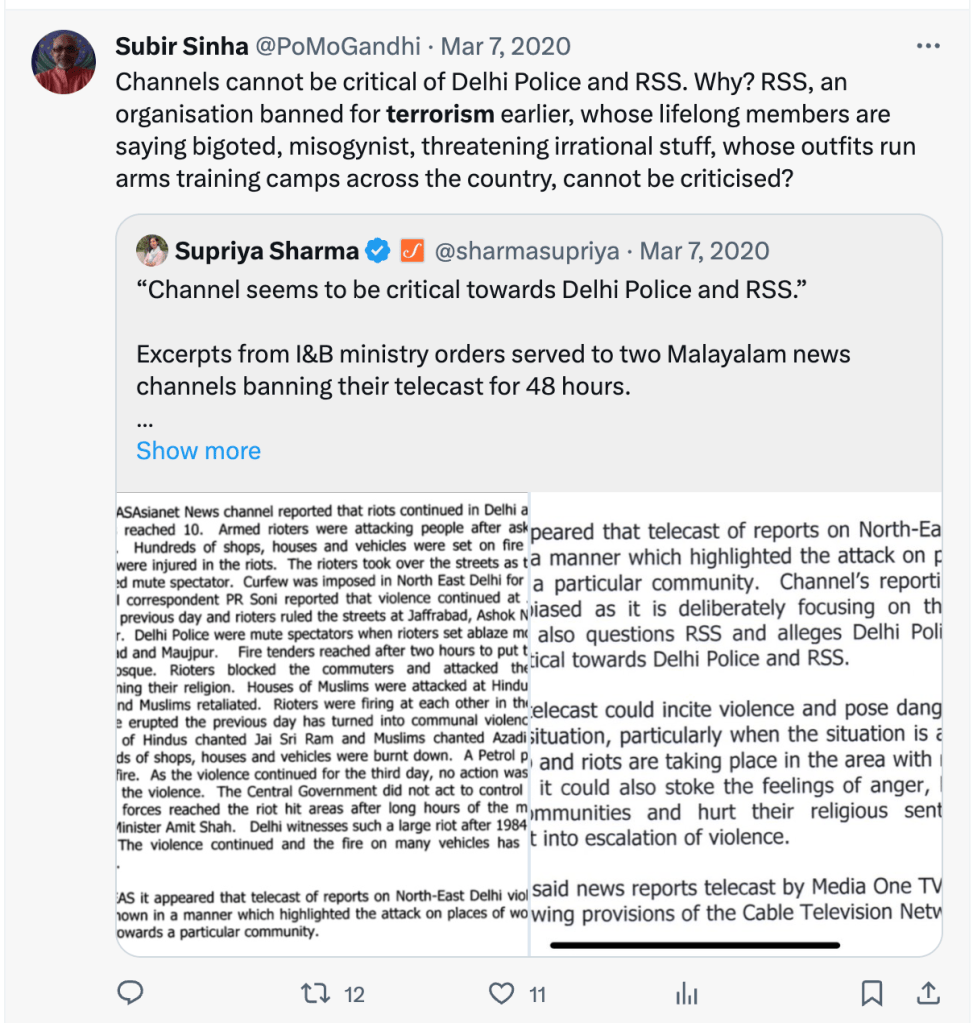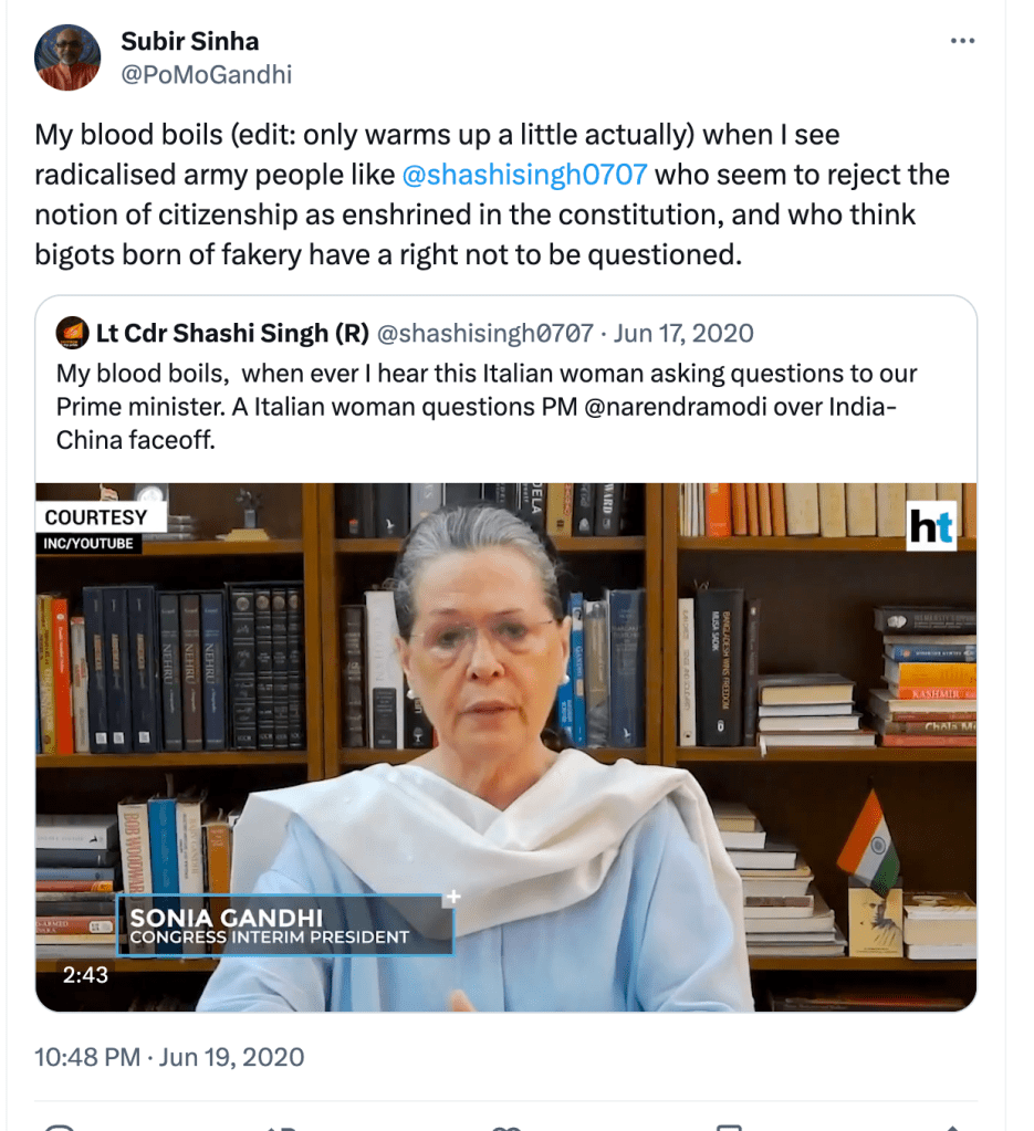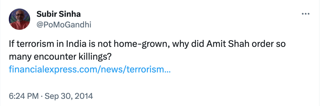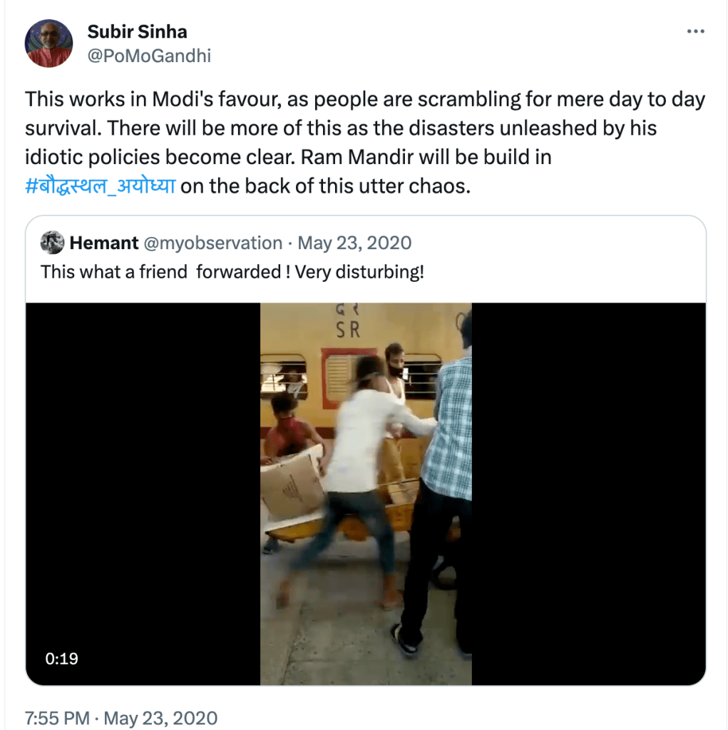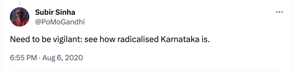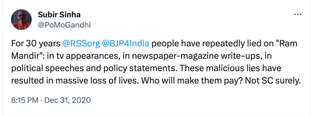 In 2014, Dr.Subir Sinha wrote for a web portal on PM Modi’s election “Modi’s BJP in massive election win – and that threatens to be a disaster for India” straight up lied that Vishwa Hindu Parishad and Bajrang Dal instigated the 2002 Godhra riots. What Subir Sinha fails to mention to the reader that Supreme Court of India convicted Muslims in Godhra for burning a train, conspiracy and murder for killing 56 innocent Hindu men, women and children. Read the Supreme Court judgement here. In the same piece, Sinha personally attacks PM Modi “……His commitment to patriarchy are evident both in his abandonment of his wife without, as far as we know, any maintenance or other rights,….”.