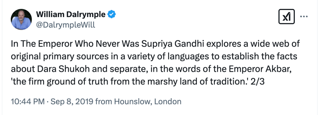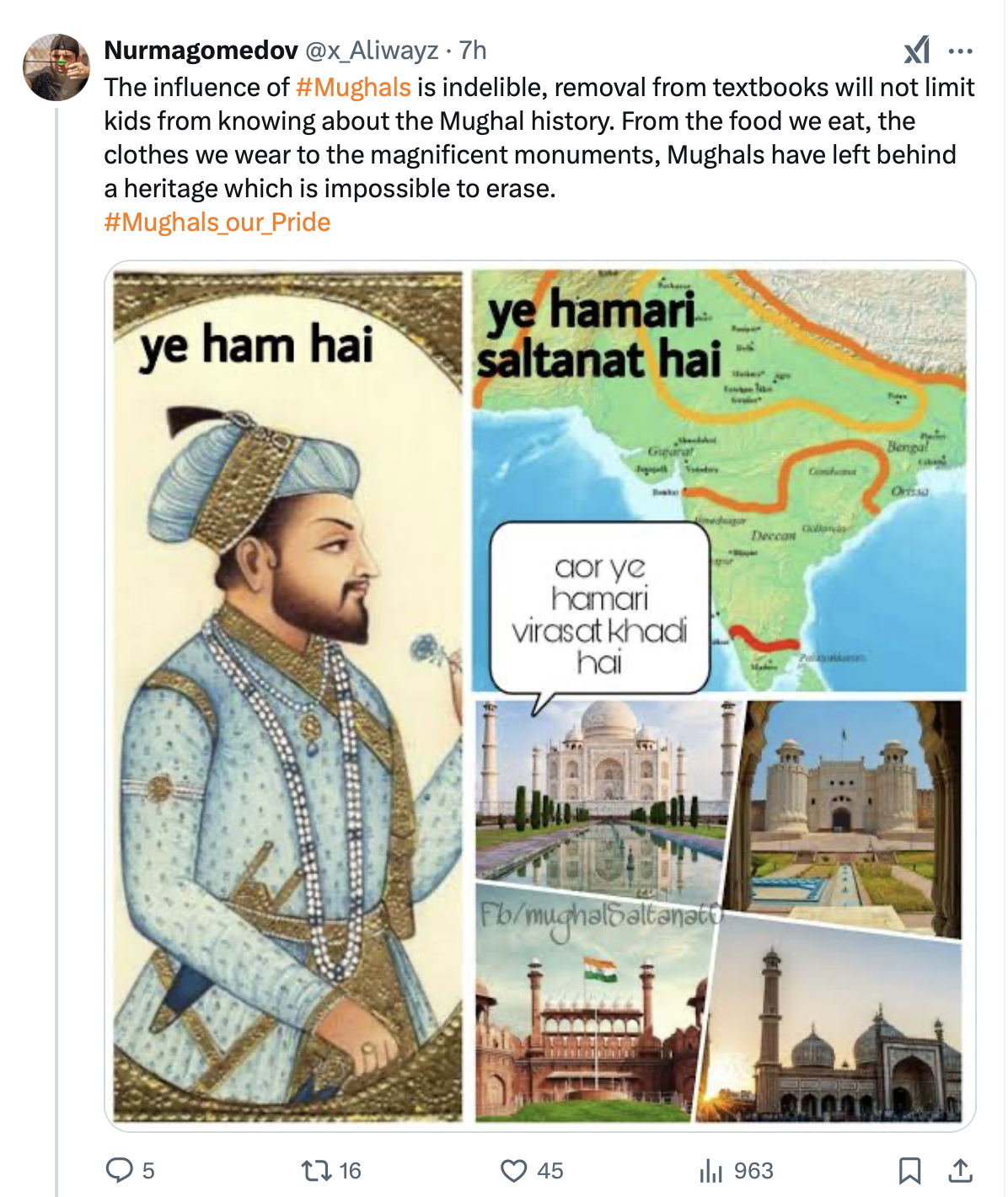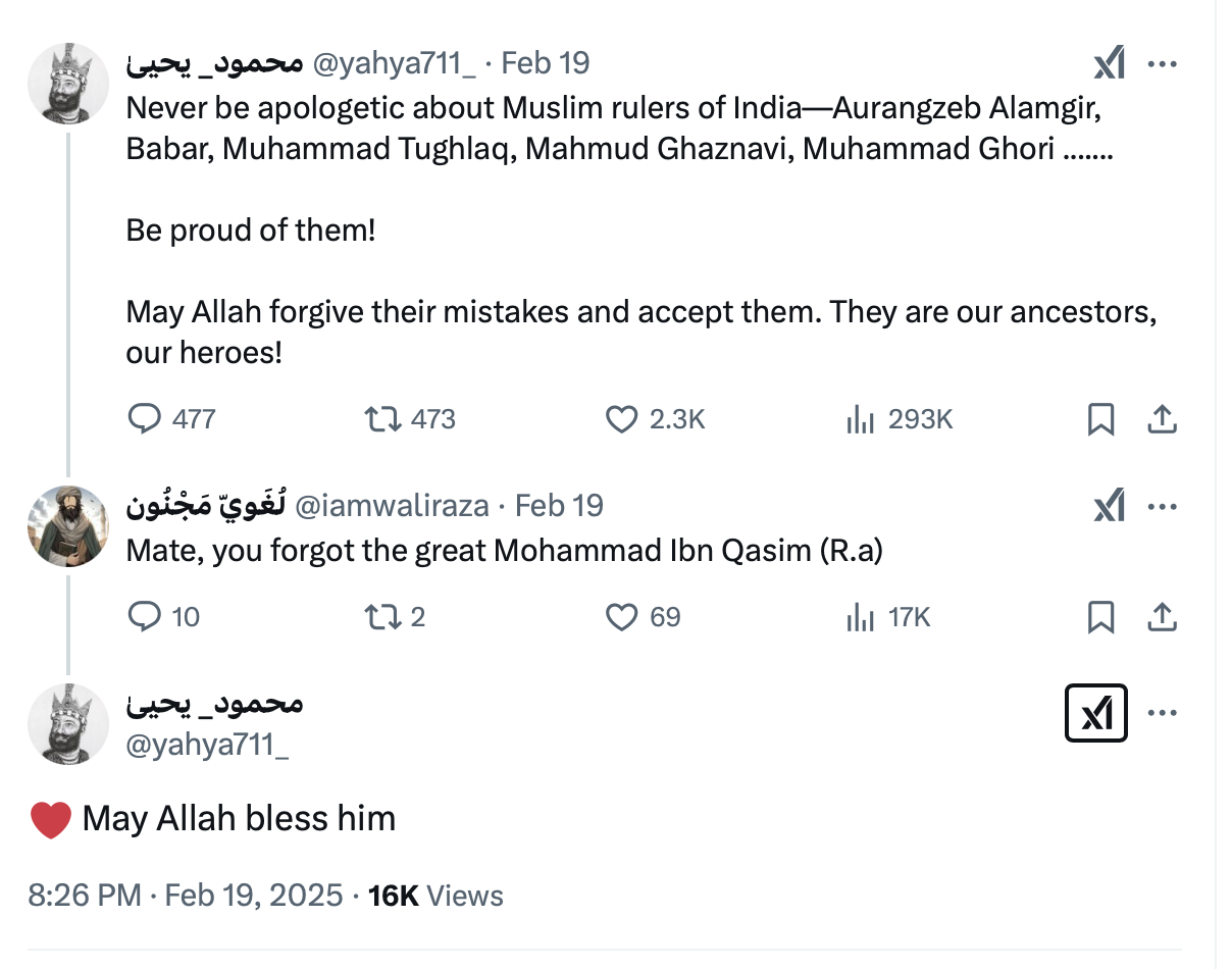 Supriya Gandhi in Building a Civilization State says the Hindu resurgence of a civilisational state “reflects the growing tide of authoritarianism worldwide as well as the internationalization of far-right political movements” and by embracing “the colonial idea of Hinduism as a world religion.” She raises objections against Hindu nationalists trying to infuse the notion of an Indian civilisational state “with a markedly Hindu character” that adopts colonial narratives that cast past “past Muslim rulers as colonial oppressors”. She views it as “Hindu supremacy”. According to Supriya Gandhi, Hindu nationalists “frame Indian Muslims as co-extensive with the historical rulers who are now targets of hatred”. This statement is economical with truth. Muslims in India still take pride in being direct or indirect descendants of Islamic invaders. With the recent outrage amongst Muslims in India over the film Chaava‘s portrayal of Chhatrapati Sambhaji Maharaj of the Maratha Empire, social media was flooded with Muslims in India taking pride in their association with Islamic invaders.